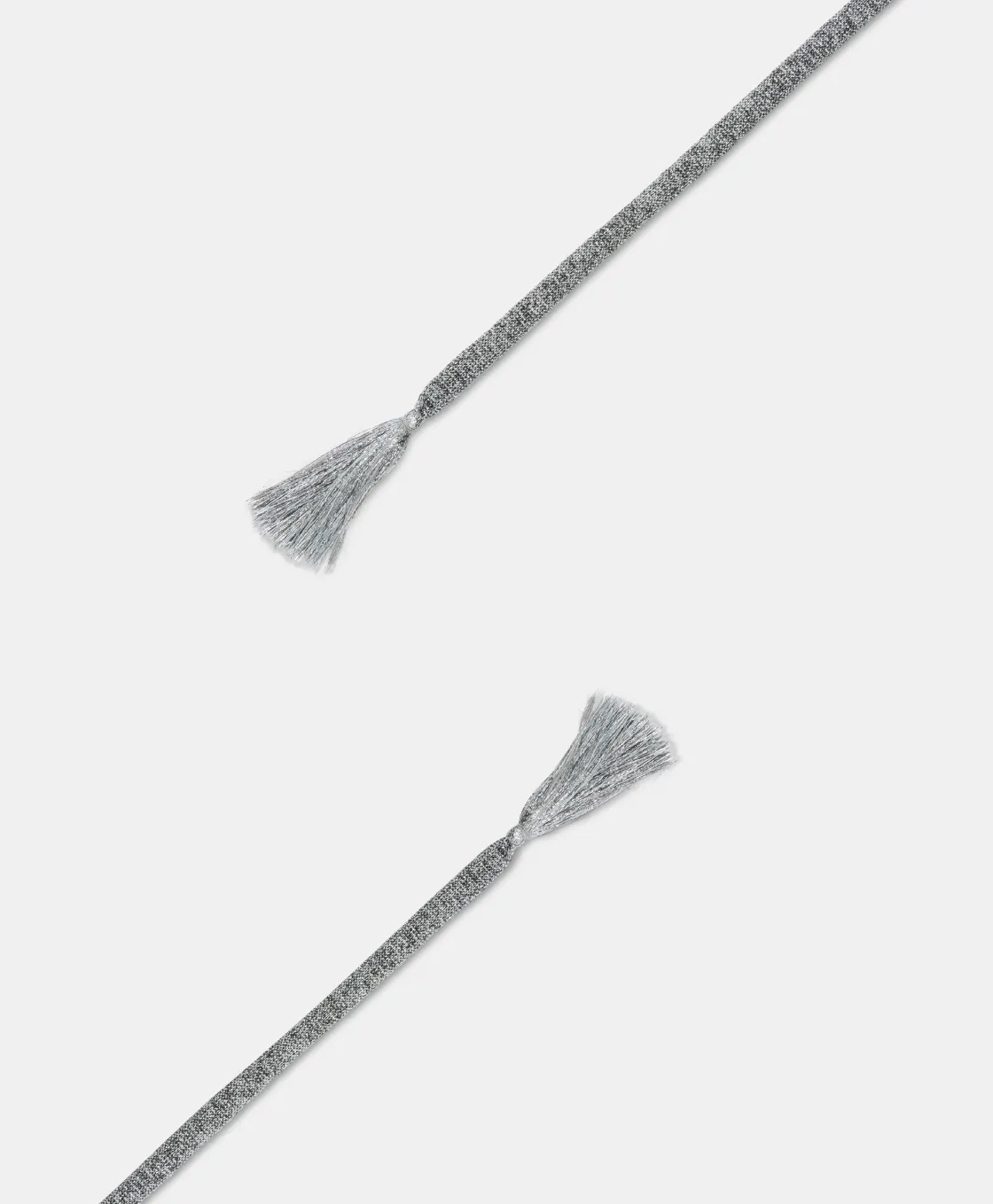Ceinture à nouer polyvalente en fil tubulaire d’acétate de lurex avec des maxi pampilles aux extrémités. Made in Italy.