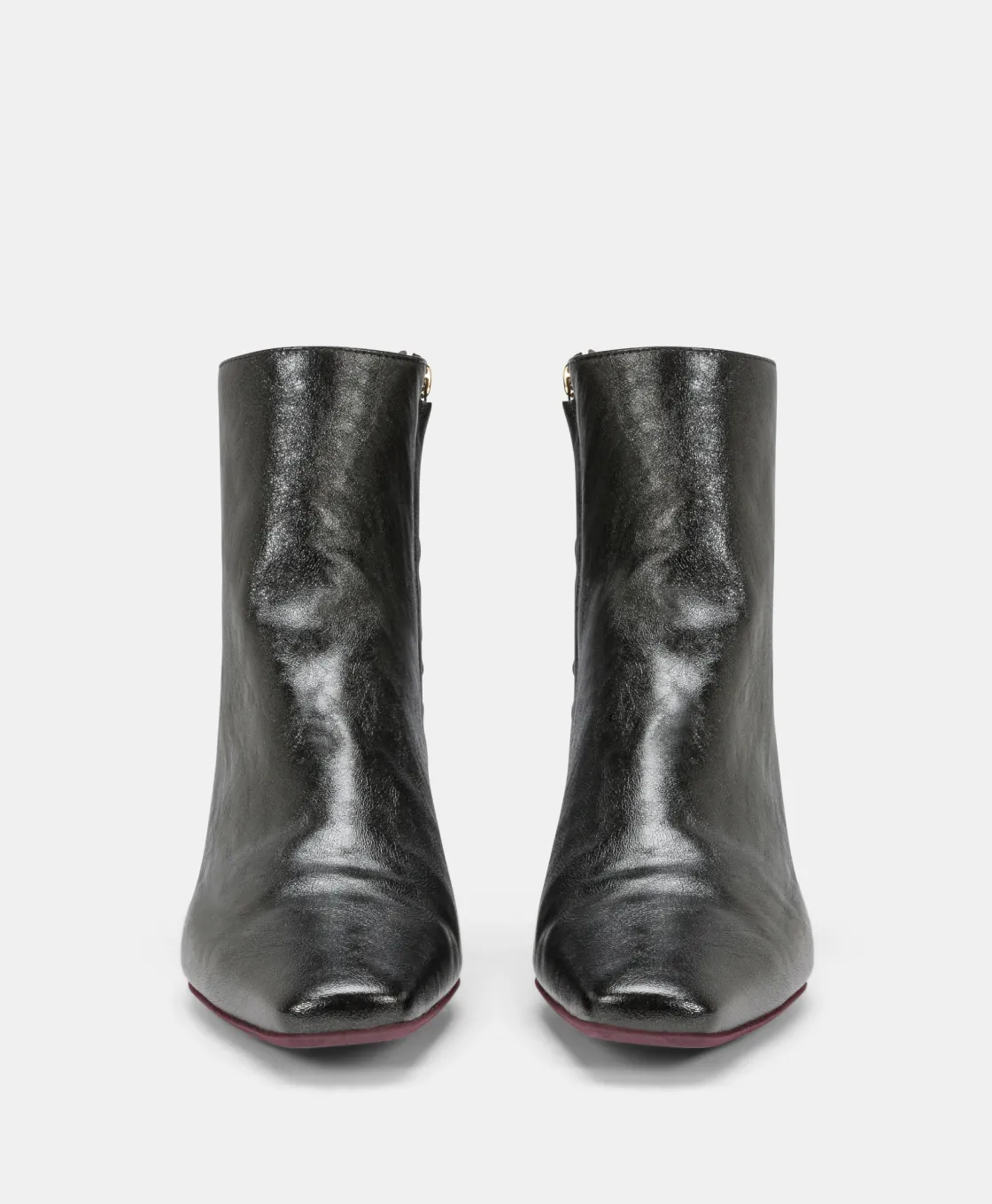 Bottine à la cheville en faux cuir laminé à l’allure rock avec une ligne de jambe arrondie qui remonte sur le devant….