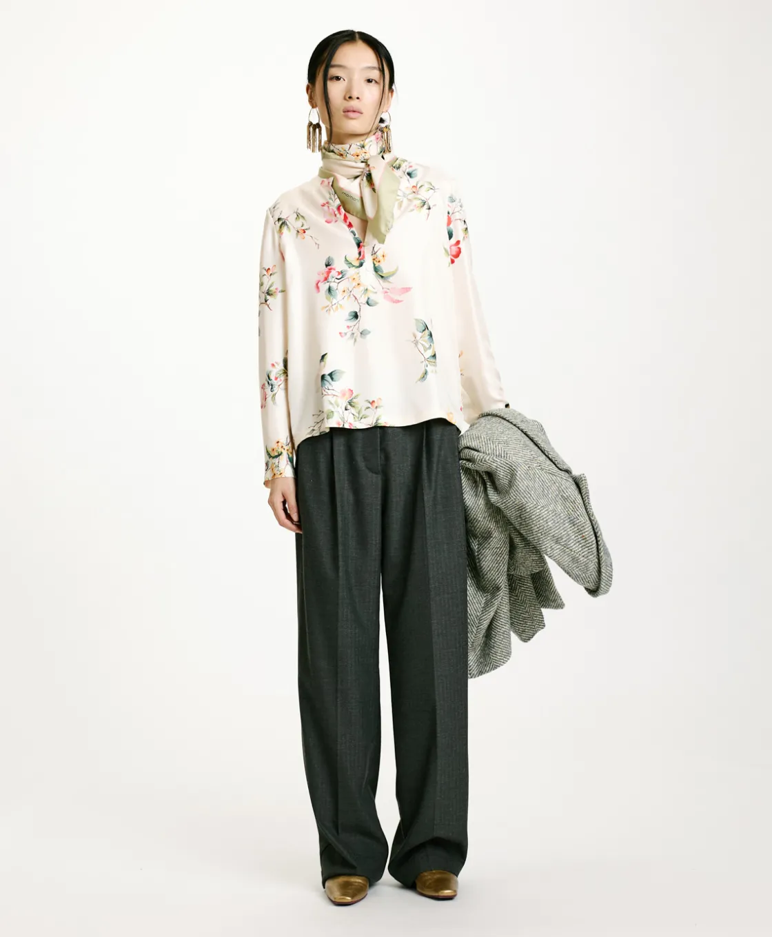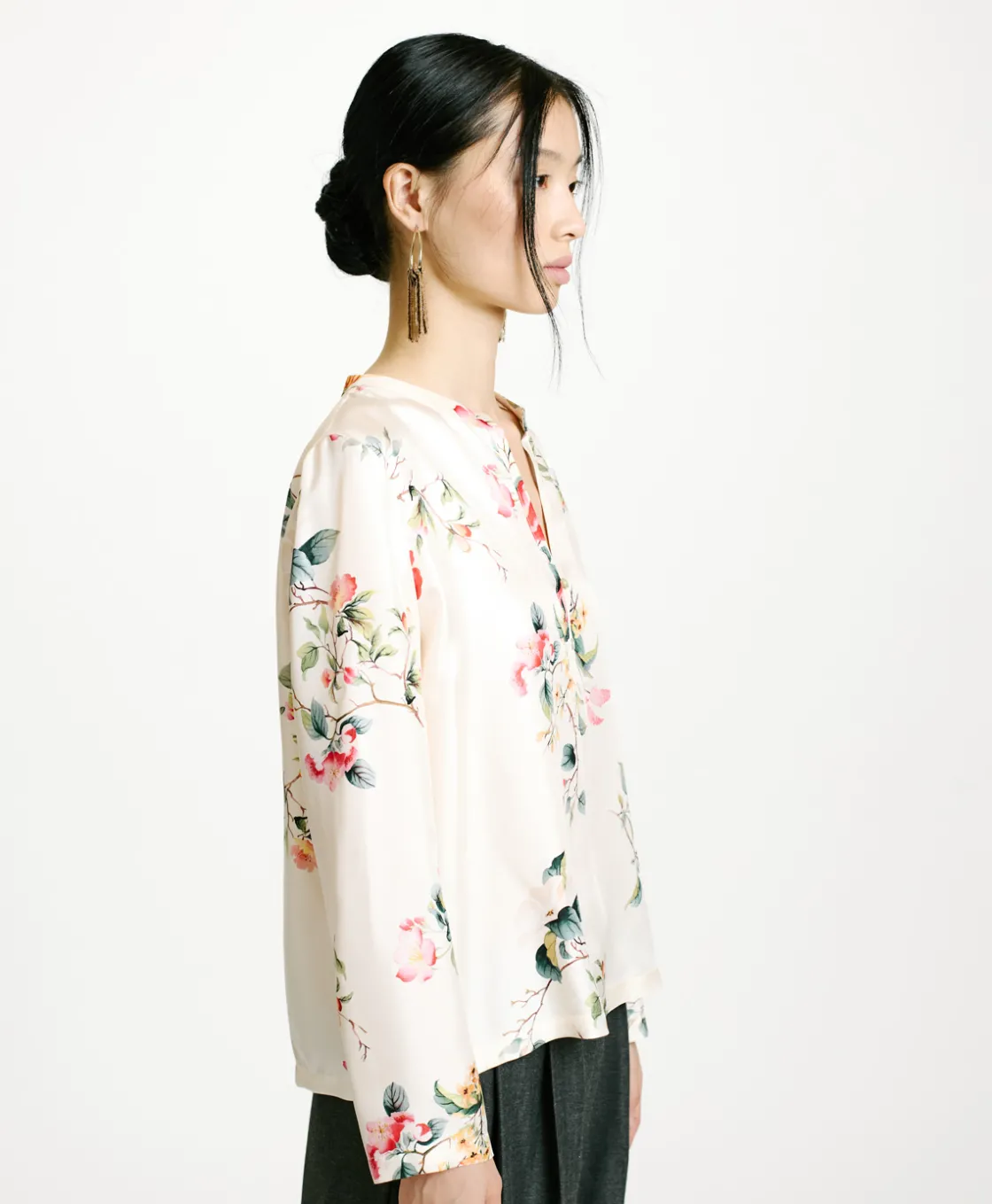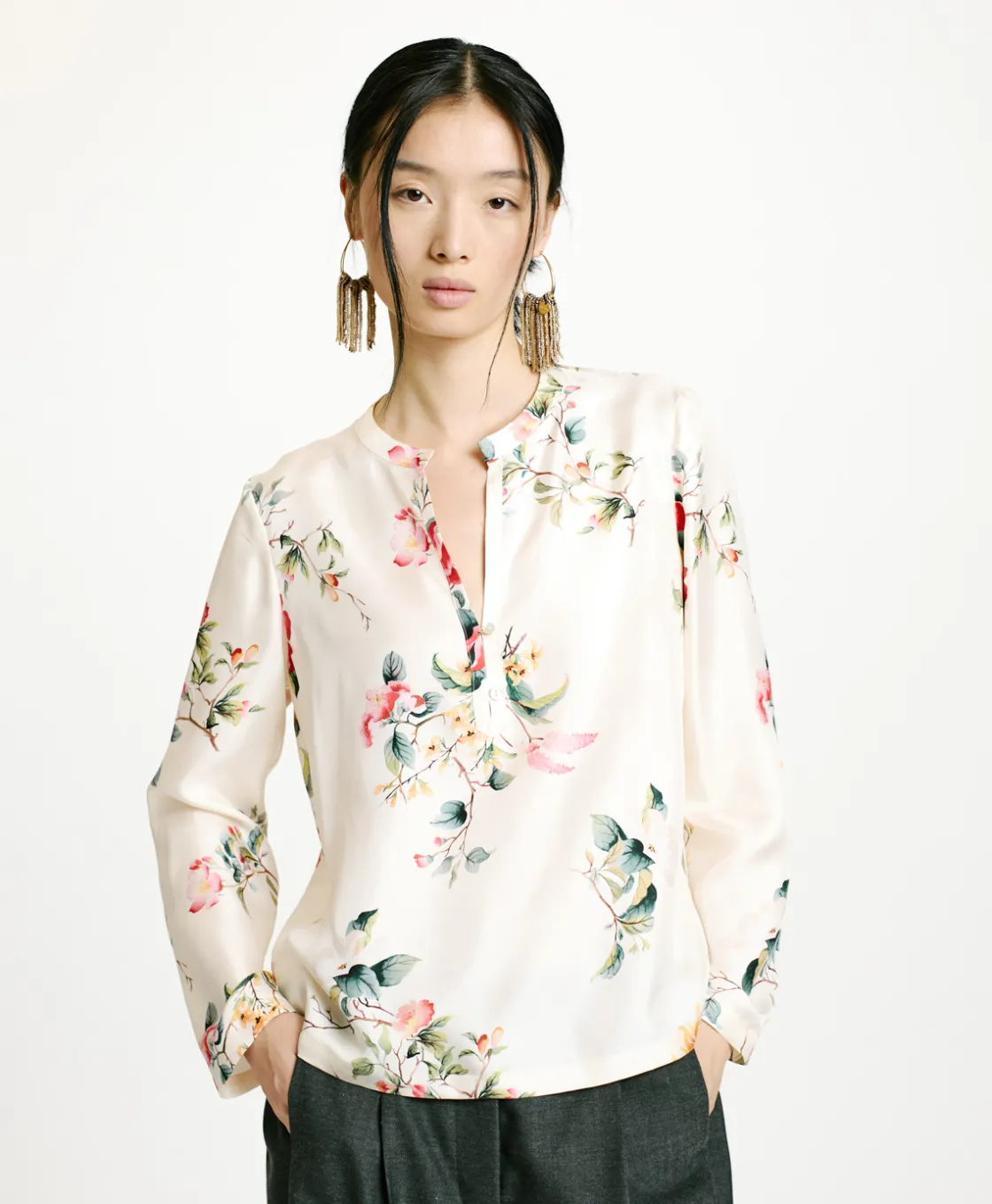Blouse en sergé de soie pure imprimée, caractérisée par une encolure polo, fermée par deux boutons recouverts et col coréen. La coupe régulière et les manches longues rendent Koke versatile et quotidienne.
