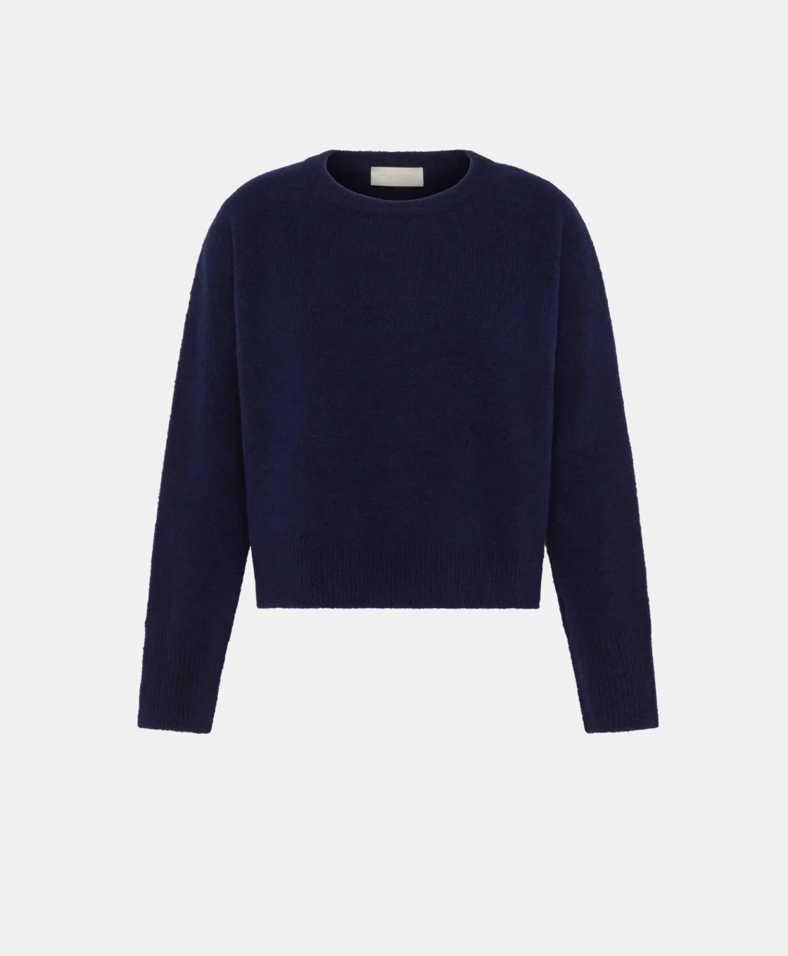 Tricot ras du cou au volume boxy en fil stretch de laine effet jersey. Flavien a des manches larges et des perforations à effet de dentelle le long des emmanchures marteau. Made in Italy.