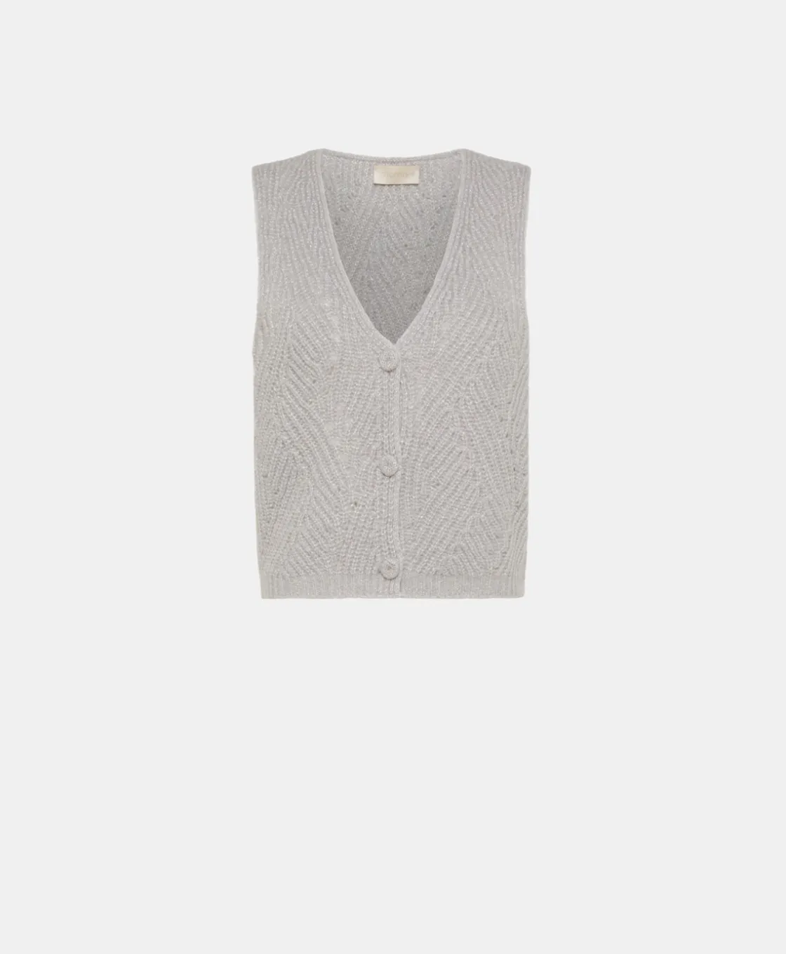 Gilet court avec boutonnage à deux boutons et col en V. Réalisé dans un tressage spécial en laine vierge douce avec des touches de lurex. Made in Italy.