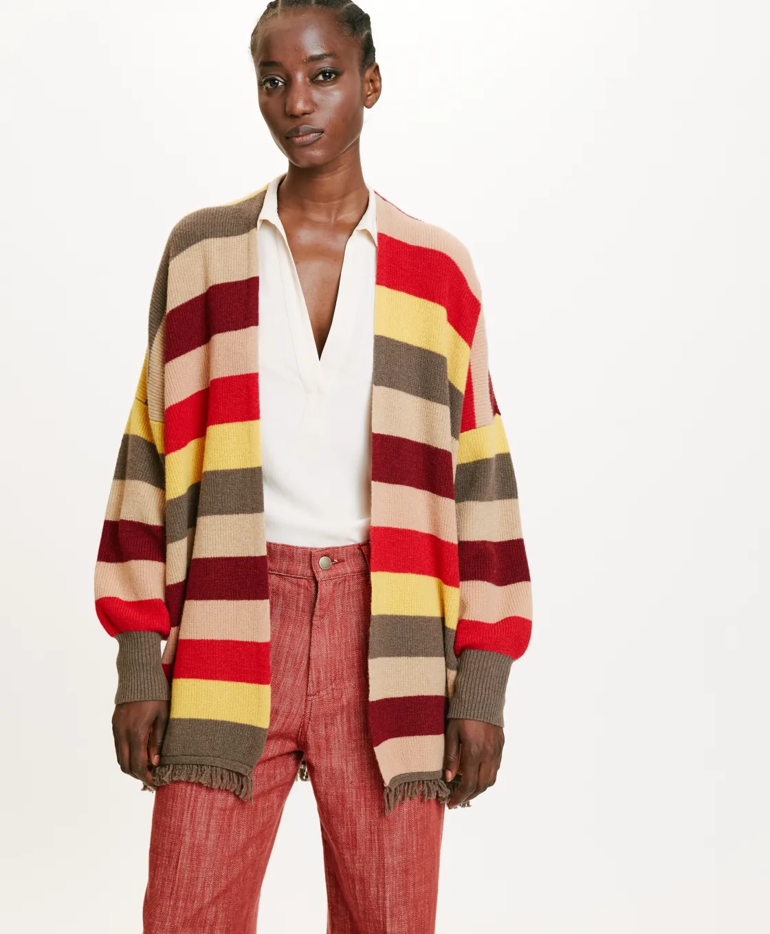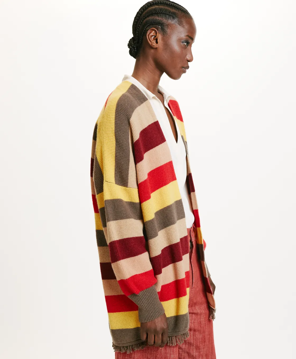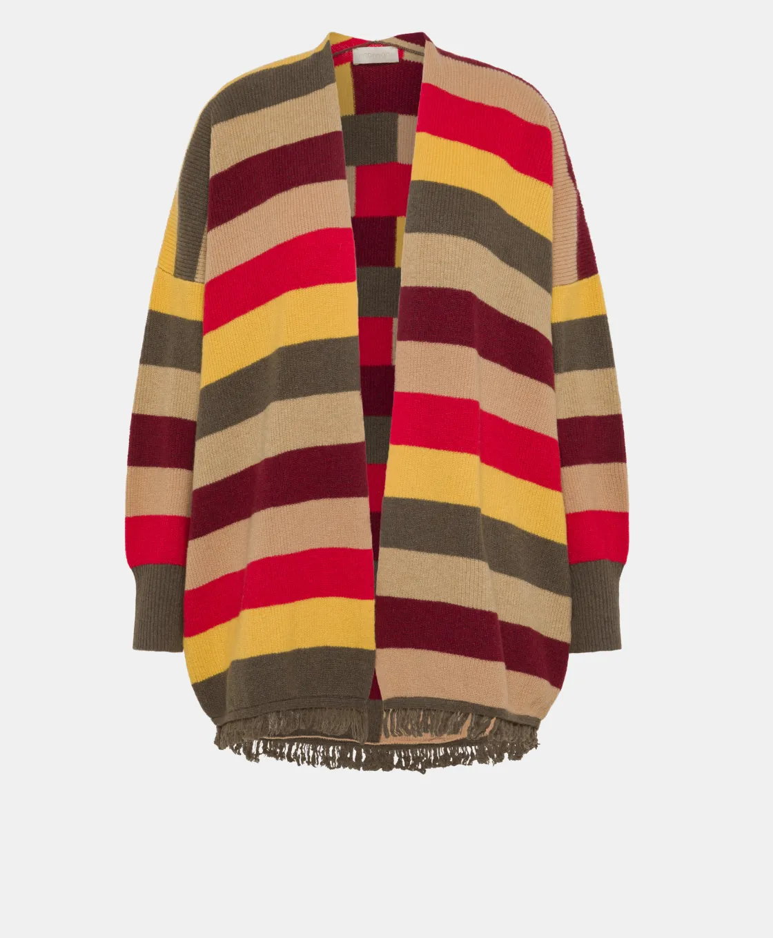 Cardigan sans boutons en mélange de laine durable, avec un pourcentage de laine recyclée. Encolure en V, devant et derrière, avec motif de rayures multicolores en quinconce. Manche longue avec poignet et bas à franges d’une seule couleur. Made in Italy.