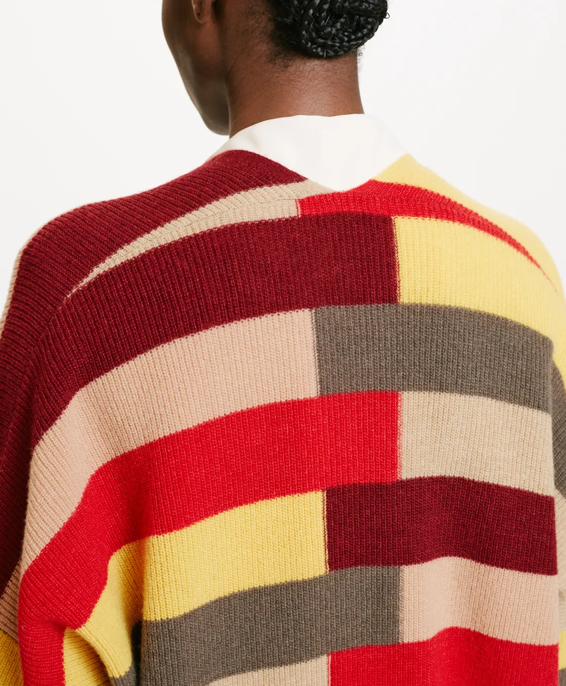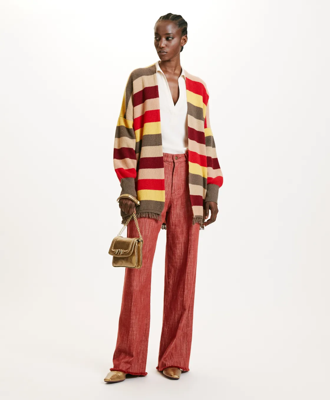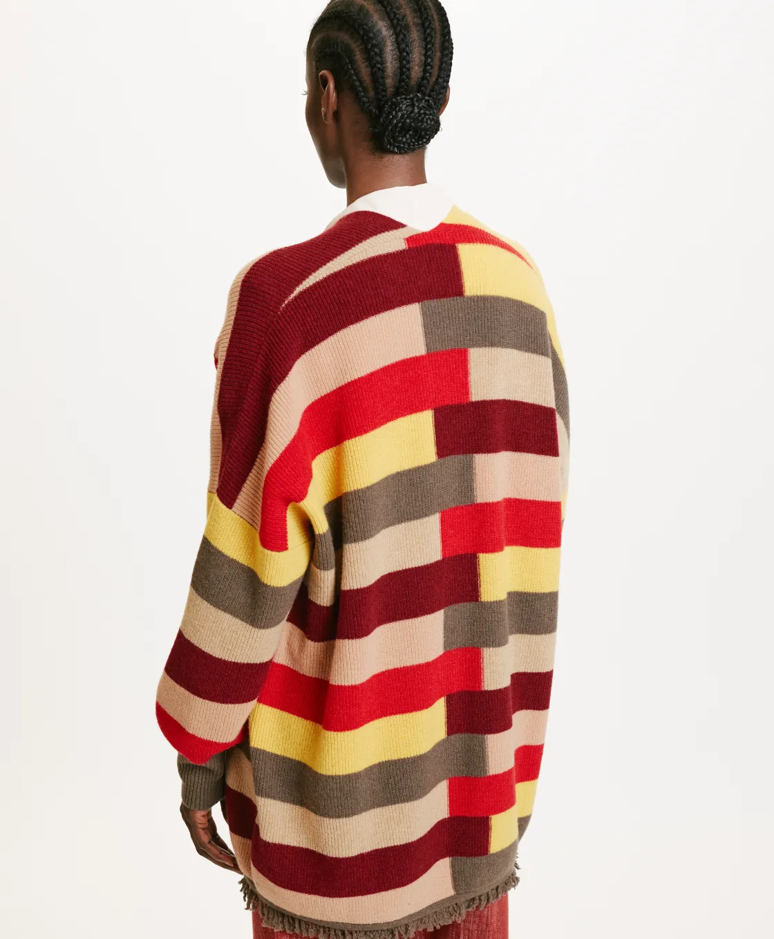 Cardigan sans boutons en mélange de laine durable, avec un pourcentage de laine recyclée. Encolure en V, devant et derrière, avec motif de rayures multicolores en quinconce. Manche longue avec poignet et bas à franges d’une seule couleur. Made in Italy.