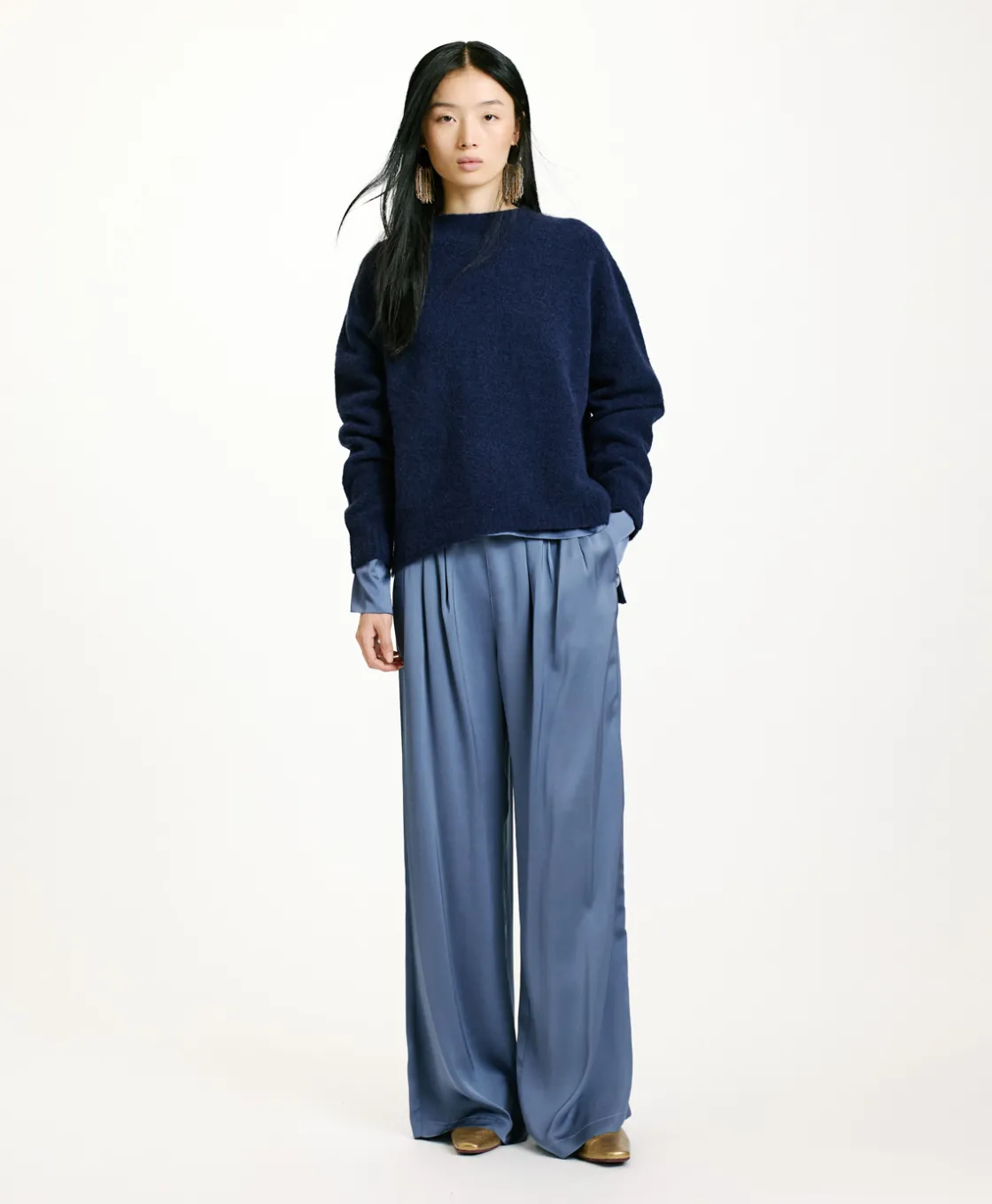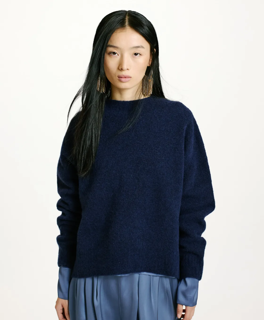 Tricot col montant en fil de laine stretch de laine effet jersey.Manches longues et épaules tombantes avec fentes laté…