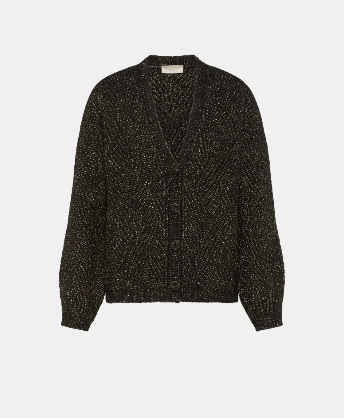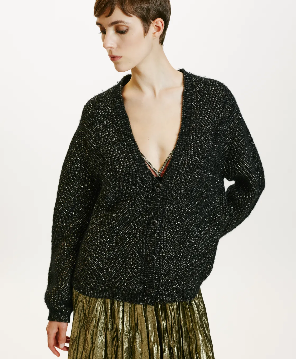Cardigan effet boxy en fil de laine vierge. Manches longues, encolure en V, sans boutons avec bordures côtelées sur le bas. Travail de tresses avec une touche de lurex.