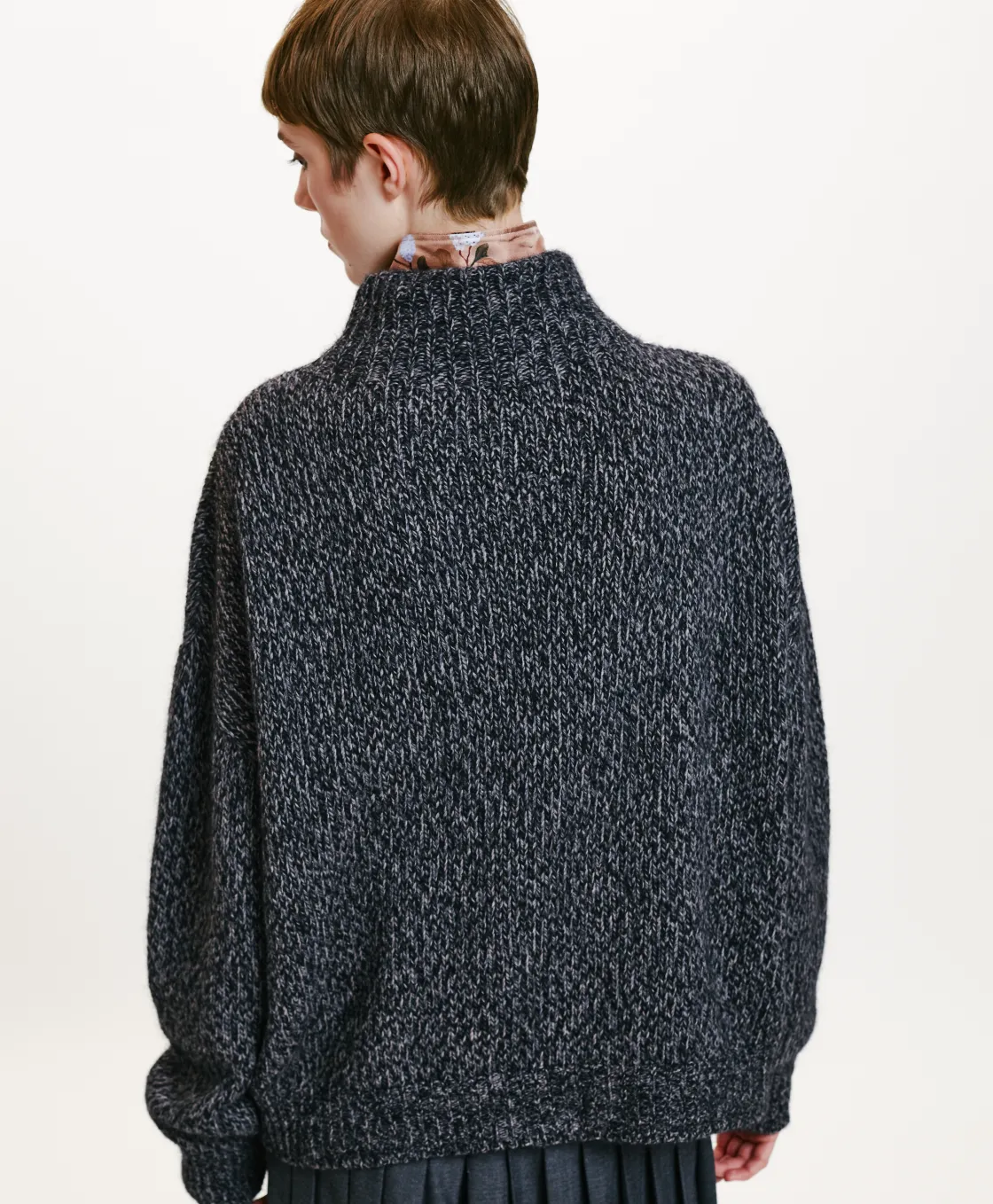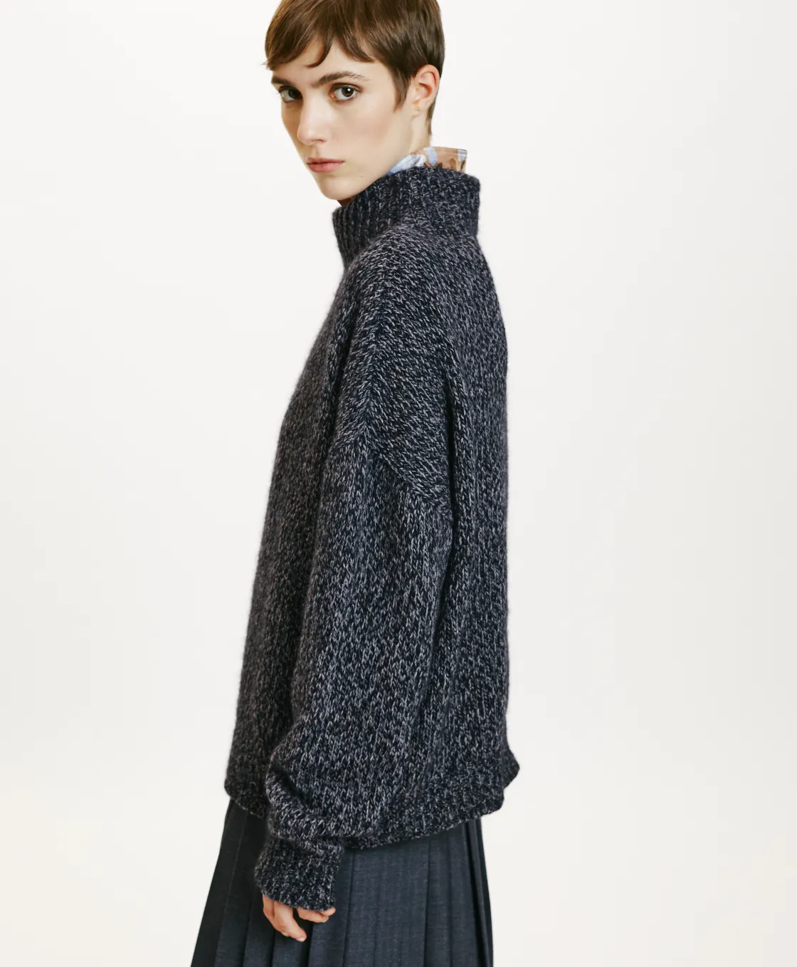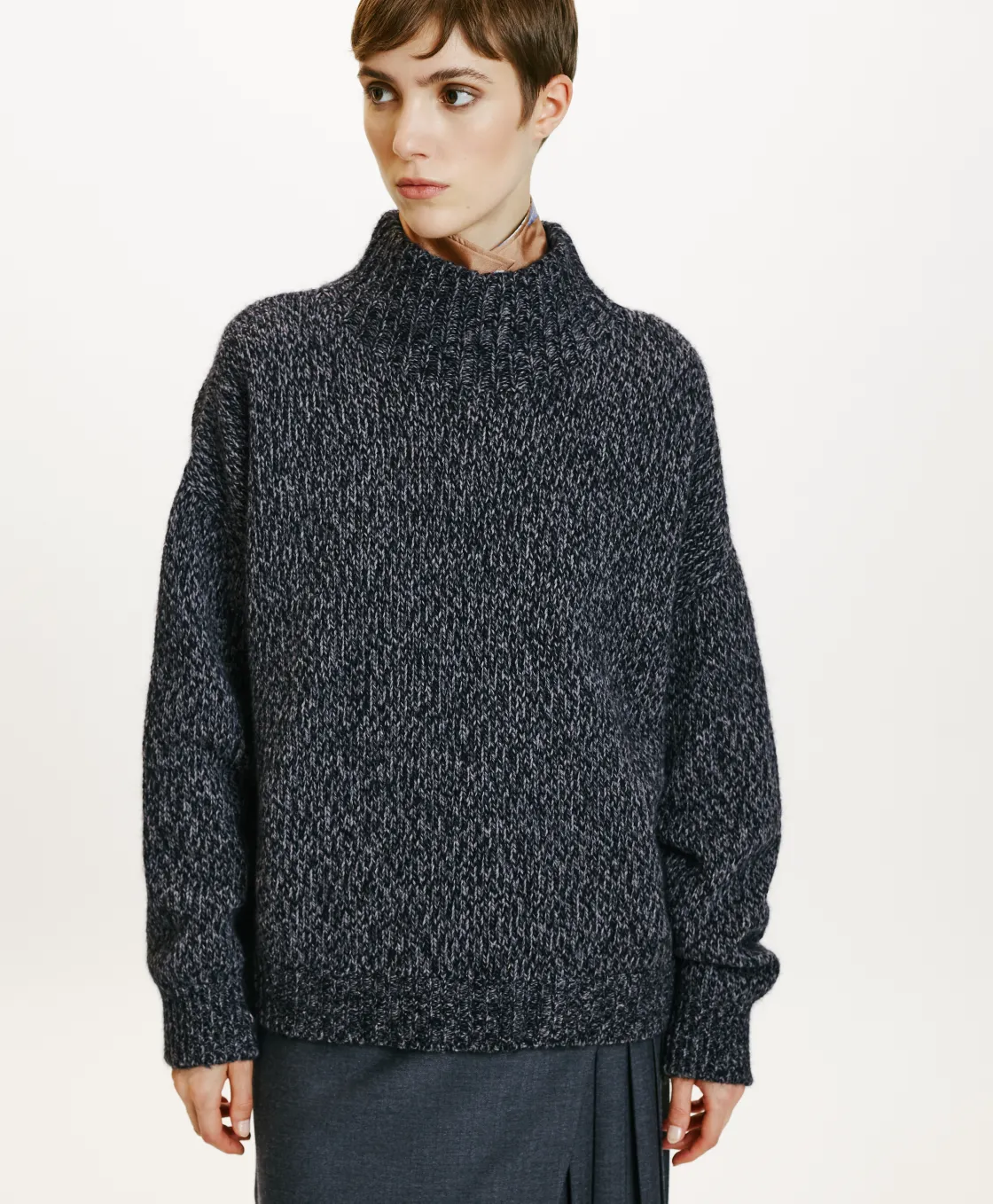 Tricot en mélange de laine, effet mouliné. Col haut, manches longues, coupe ajustée. Made in Italy