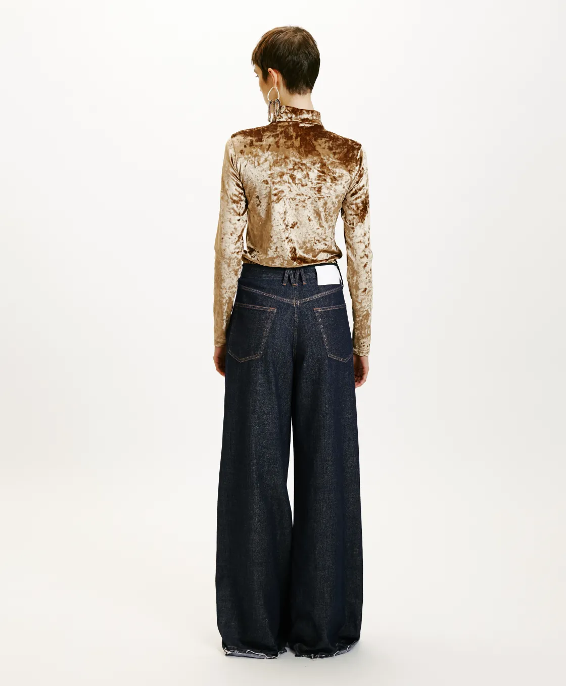 Pantalon à 5 poches en denim de coton avec laminage. Longue jambe droite, sangle construite avec passant en forme de M au dos, ouverture à boutons clouté et fermeture éclair.