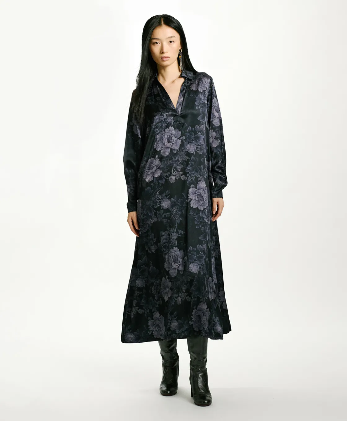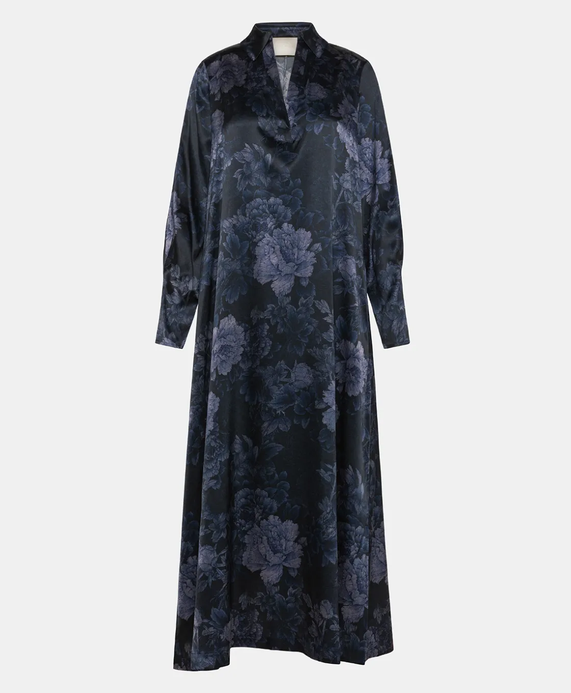 Une robe tunique longue raffinée et essentielle, à la ligne évasée, en satin de soie stretch imprimé. Présentant une encolure en V et un col voile, ce modèle possède des manches bouffantes relevées par un généreux pli au bas, au-dessus du poignet. Poches insérées sur les côtés.
