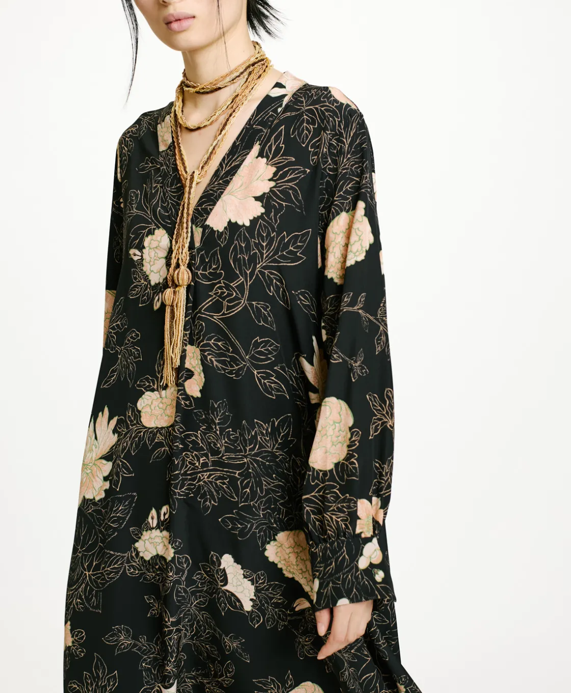 Tunique évasée en crêpe de chine de soie imprimée avec encolure en V sans boutons et plis centraux pour donner du volume au corps. Manches longues avec poignet haut, fermées par un bouton et un œillet élastiqué, avec une riche fronce au bas. Poches insérées sur les côtés.