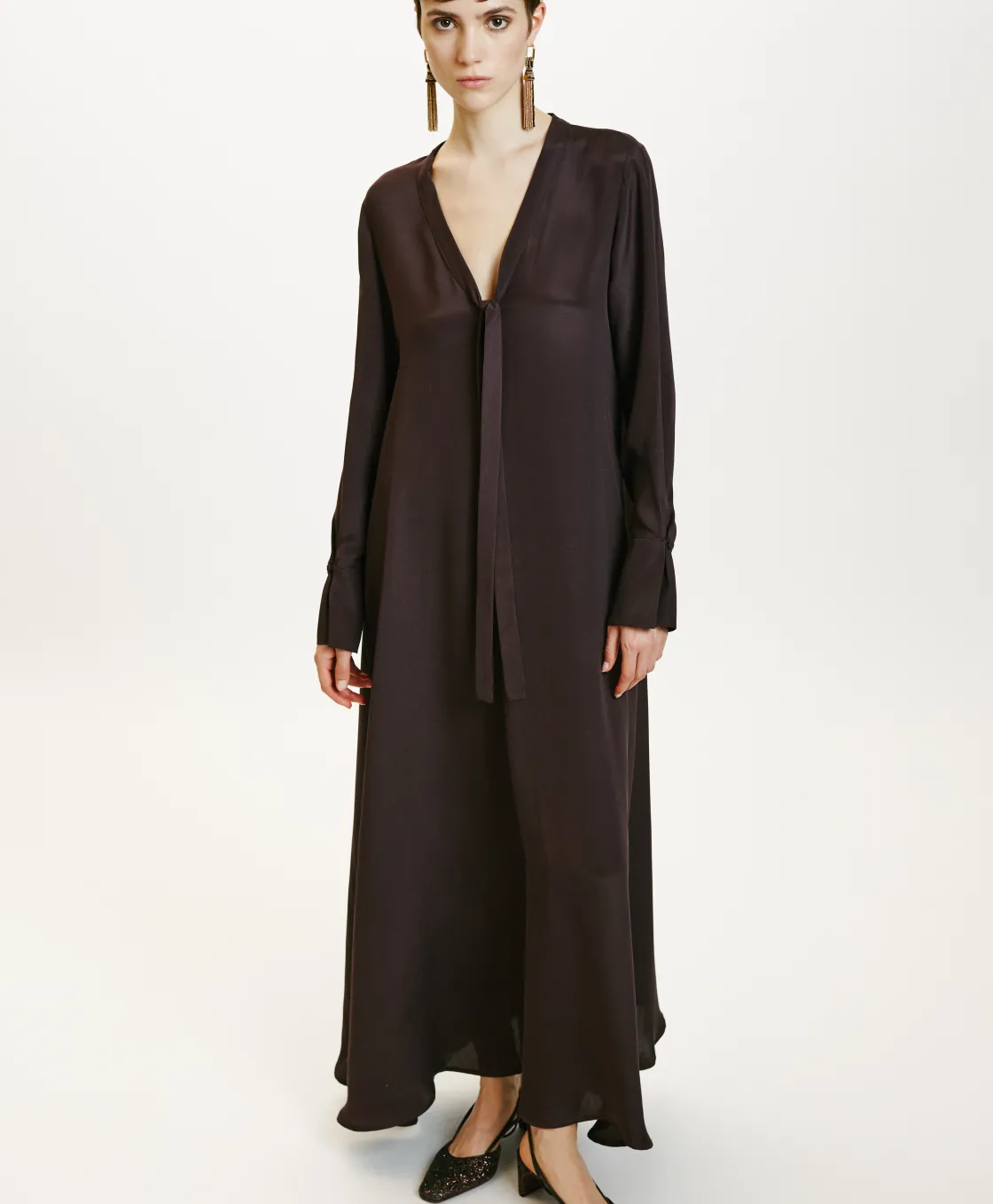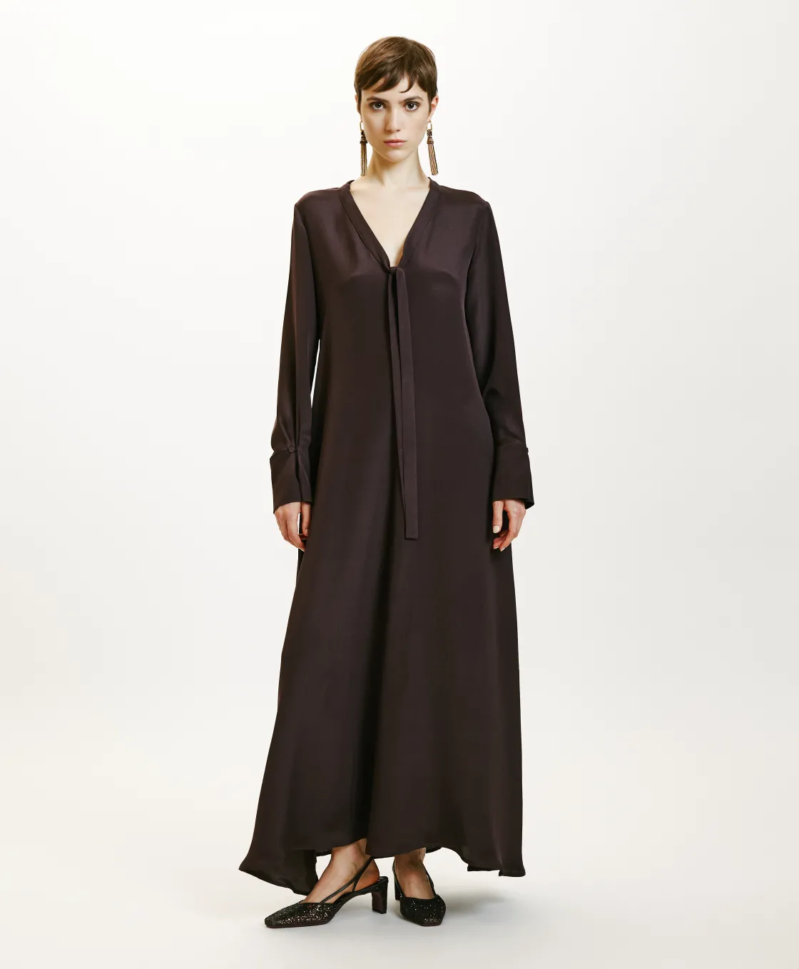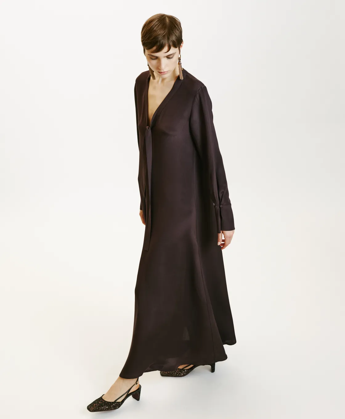 Longue robe évasée en mélange de soie, avec un profond décolleté en V et un fine bride sur le devant, à porter dénouée ou nouée. Manches longues avec poignet haut détaillé par un pli soufflet fermé par un bouton et une boutonnière élastique. Un vêtement recherché, indiqué pour toutes les occasions.