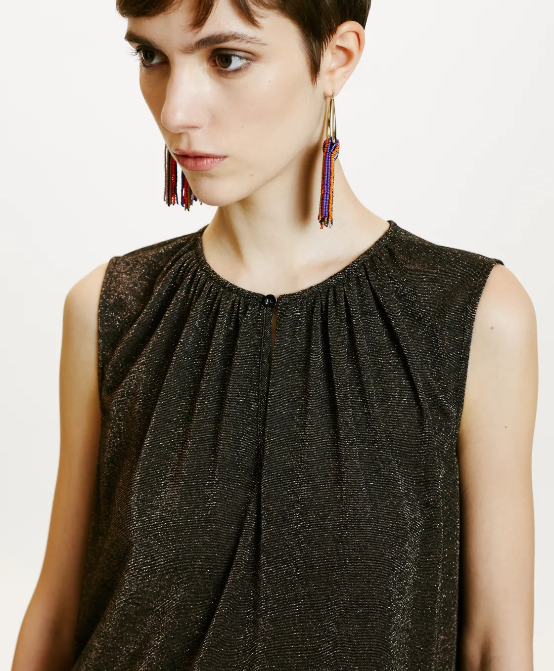 Élégant top sans manches en jersey lurex, enrichi d’un petit volant sur l’encolure et fermé par un bouton recouvert.