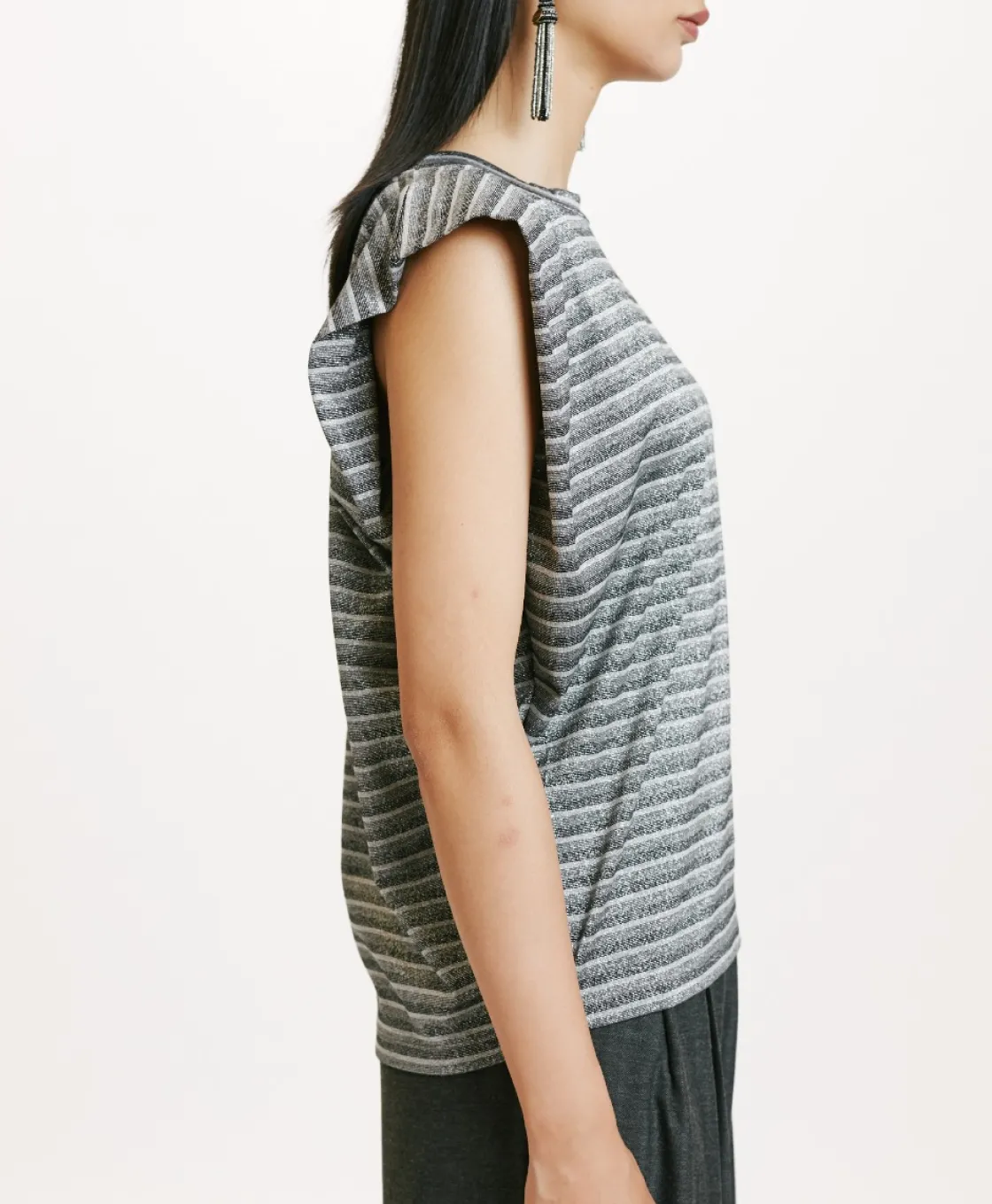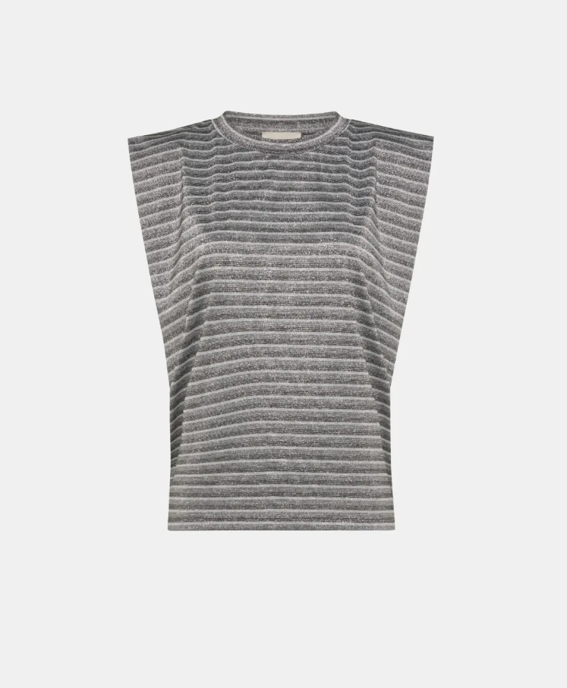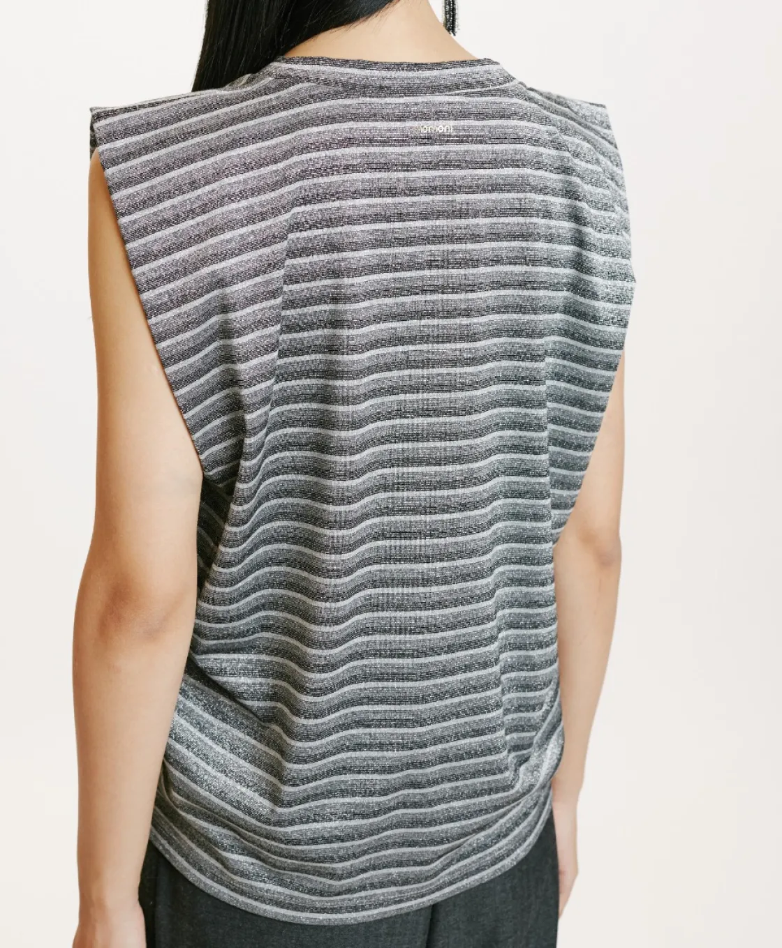 Top à col rond en jersey lurex carry-over. Ligne droite et essentielle avec des épaules prononcées. Un basique revisité dans le style des années 80, parfait pour ajouter une touche cool à chaque tenue.