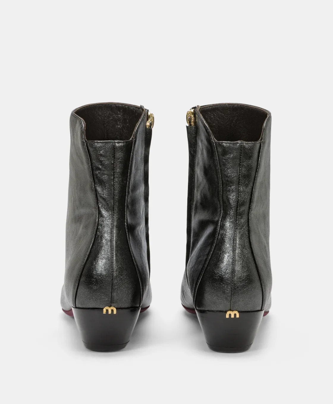 Bottine à la cheville en faux cuir laminé à l’allure rock avec une ligne de jambe arrondie qui remonte sur le devant. Bout allongé, un peu carré et talon à large base. Ouverture zippée latérale cachée sous une lèvre, semelle colorée et fin détail M doré sur l’attache du talon à l’arrière.