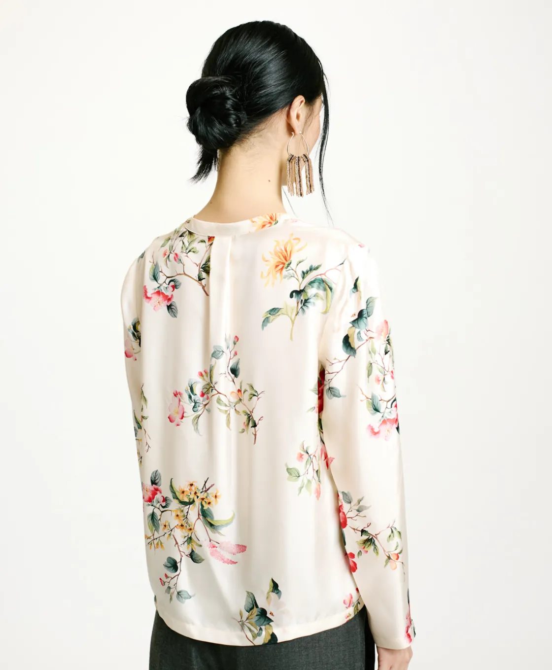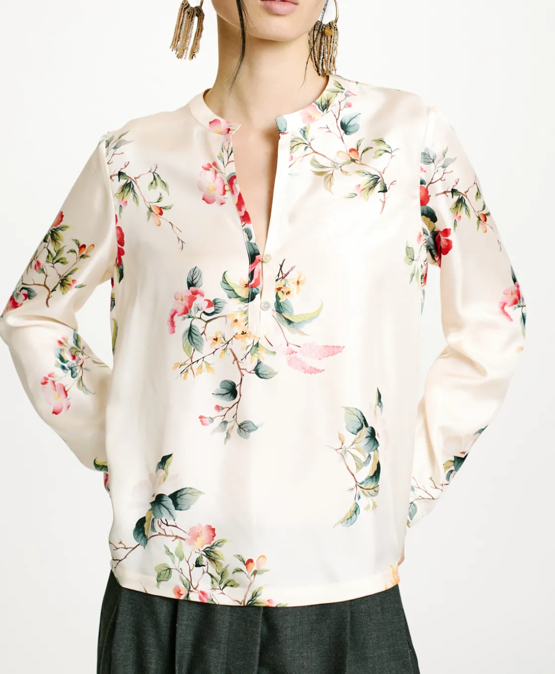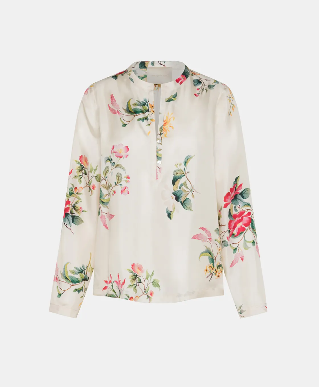 Blouse en sergé de soie pure imprimée, caractérisée par une encolure polo, fermée par deux boutons recouverts et col coréen. La coupe régulière et les manches longues rendent Koke versatile et quotidienne.