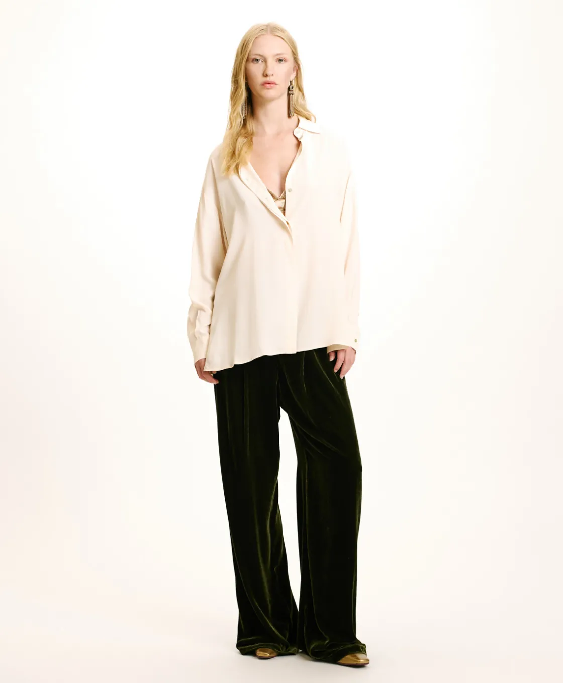 Chemisier en crêpe de soie à col voile, manches longues, boutonnage caché. Bas de manche avec poignet et fente de type homme, fermé par un bouton et plis. Coupe ajustée avec fentes latérales.