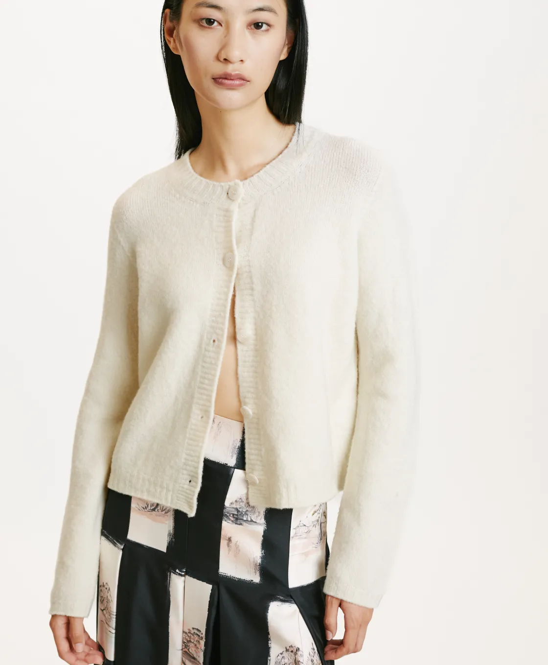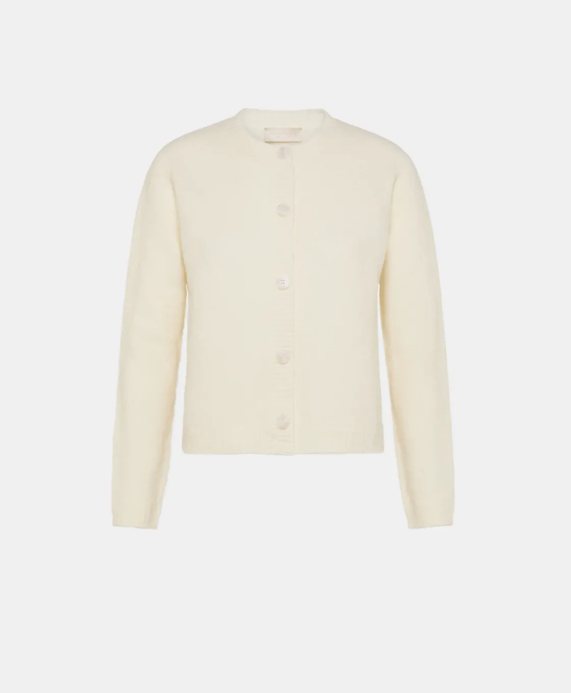 Petit cardigan au volume slim, en laine stretch à effet molletonné. Made in Italy