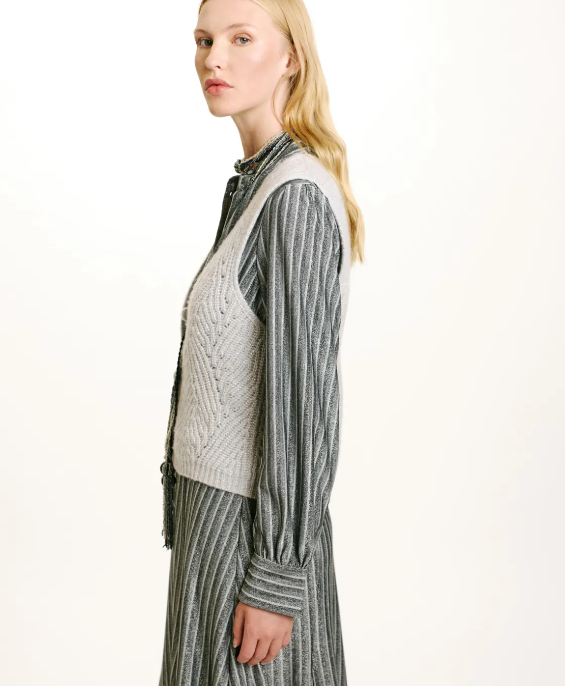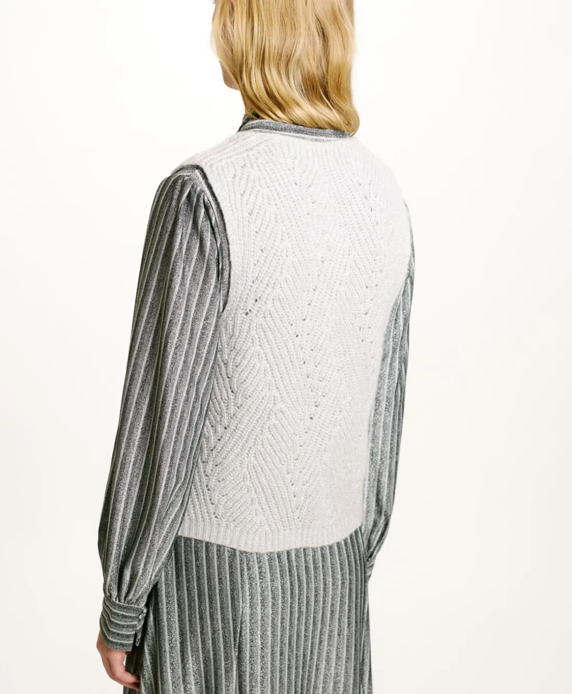 Gilet court avec boutonnage à deux boutons et col en V. Réalisé dans un tressage spécial en laine vierge douce avec des touches de lurex. Made in Italy.