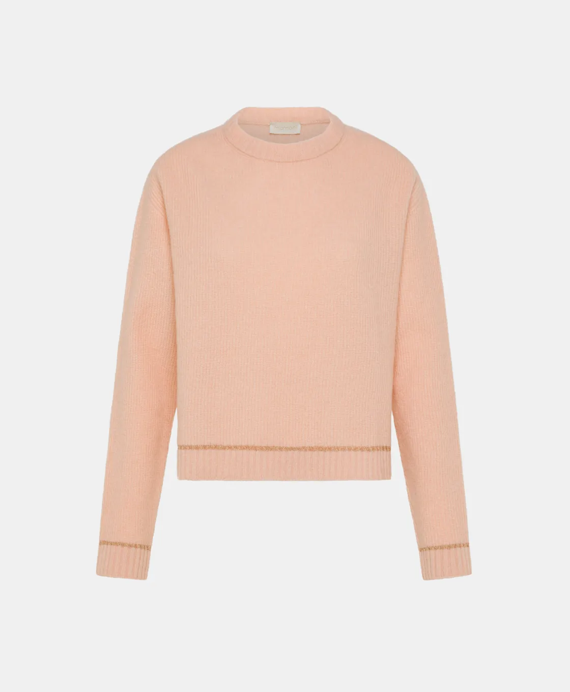 Tricot court en fil de laine vierge stretch. Col ras du cou, manches longues avec un détail en lurex sur le bas et les poignets. Made in Italy.
