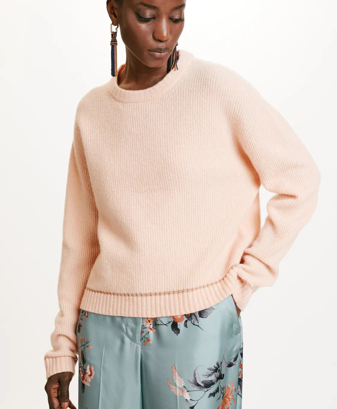 Tricot court en fil de laine vierge stretch. Col ras du cou, manches longues avec un détail en lurex sur le bas et les …