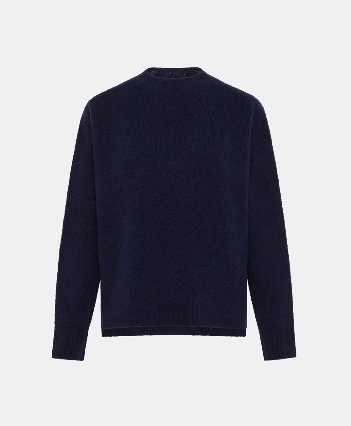 Tricot col montant en fil de laine stretch de laine effet jersey. Manches longues et épaules tombantes avec fentes latérales. Made in Italy