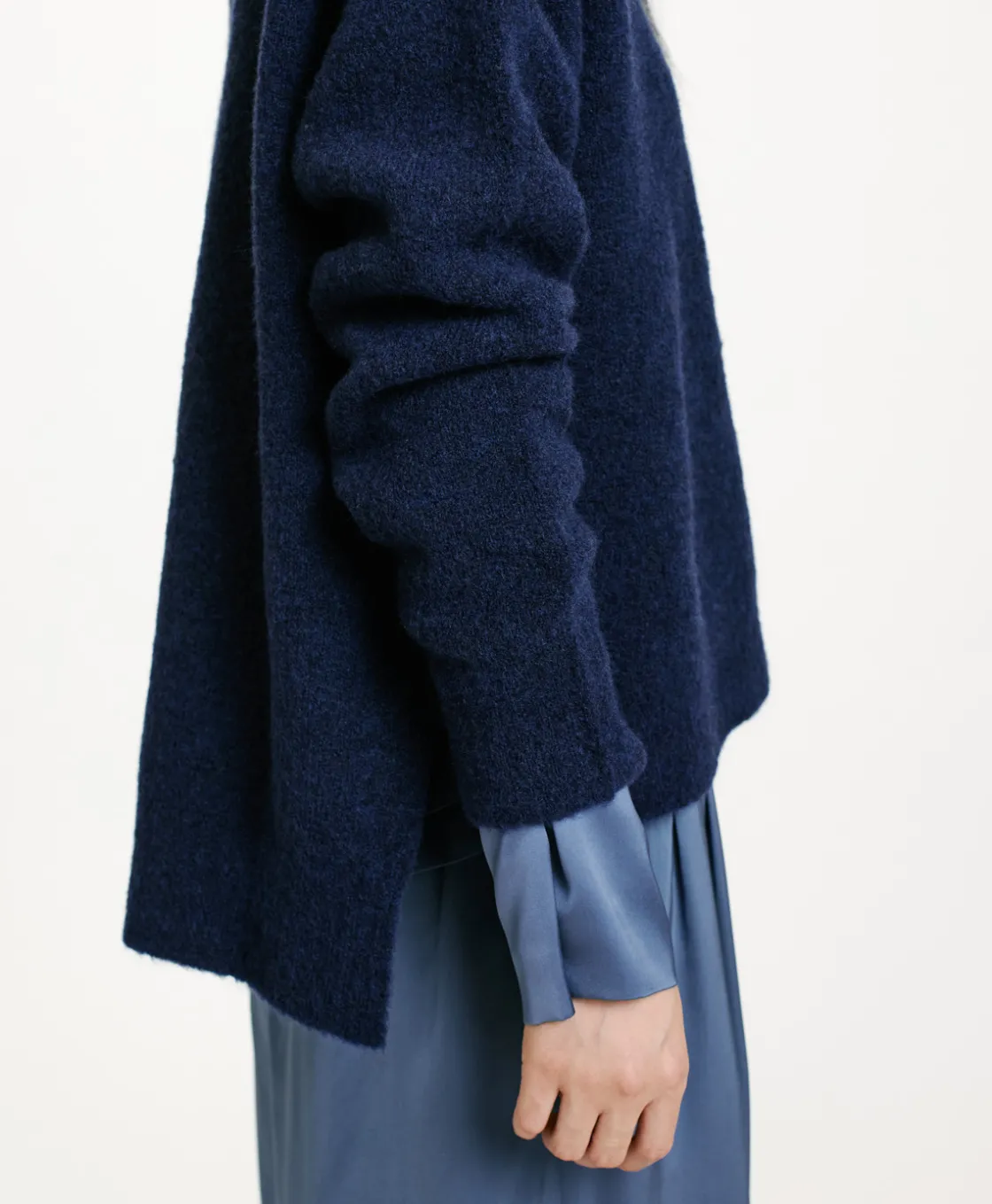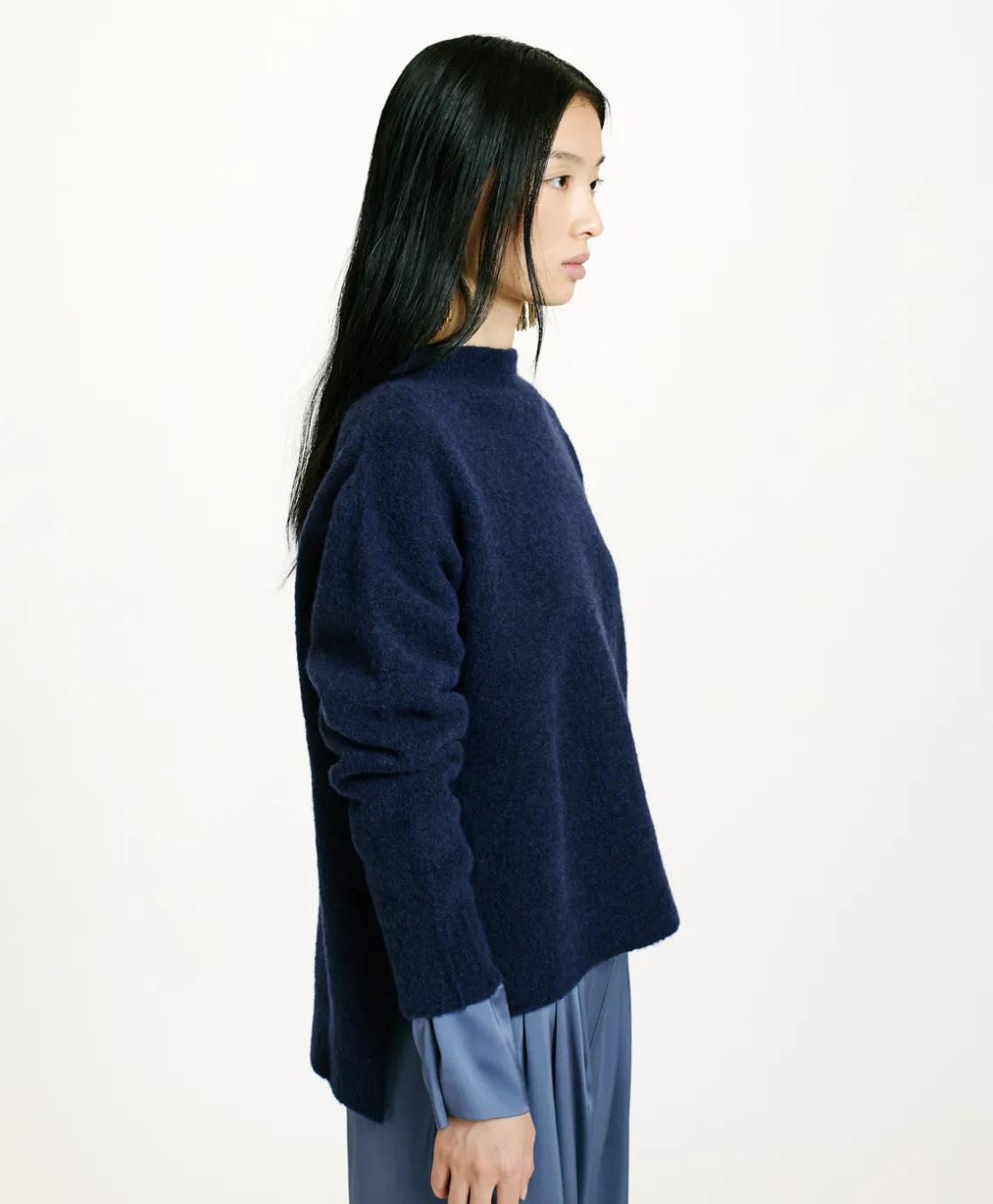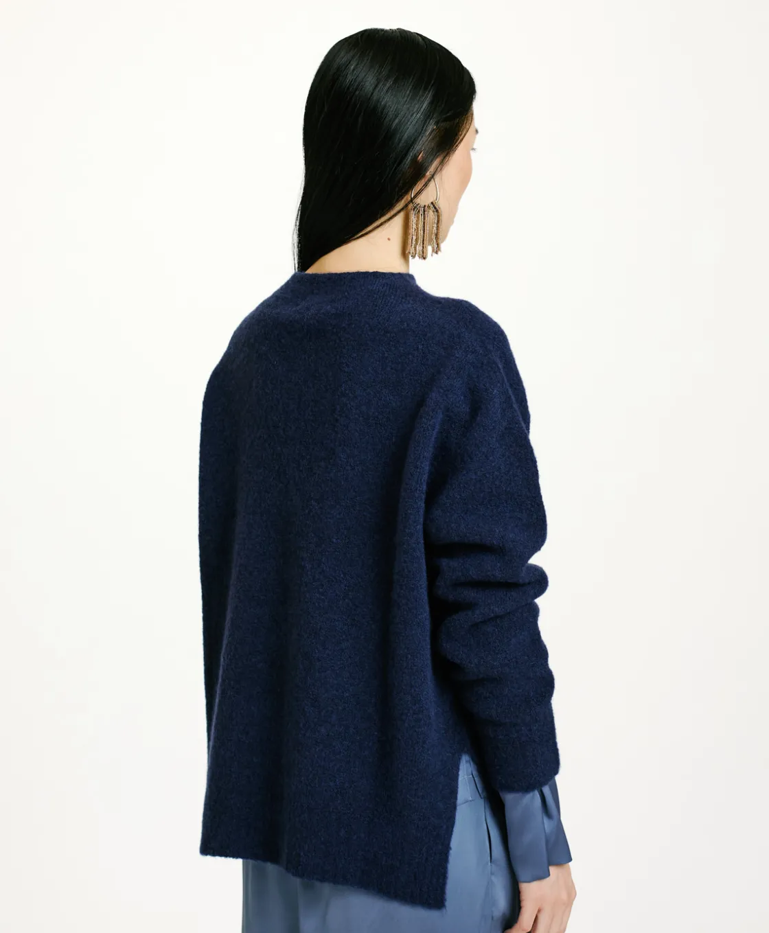 Tricot col montant en fil de laine stretch de laine effet jersey.Manches longues et épaules tombantes avec fentes laté…