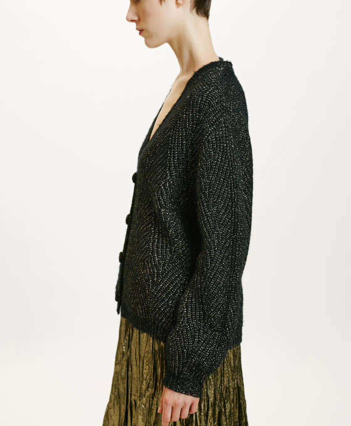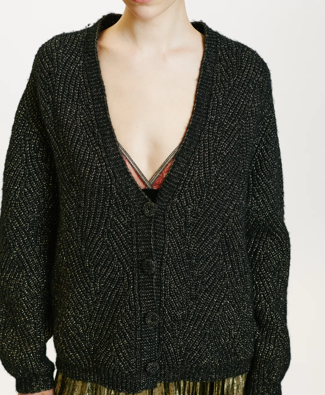 Cardigan effet boxy en fil de laine vierge. Manches longues, encolure en V, sans boutons avec bordures côtelées sur le bas. Travail de tresses avec une touche de lurex.