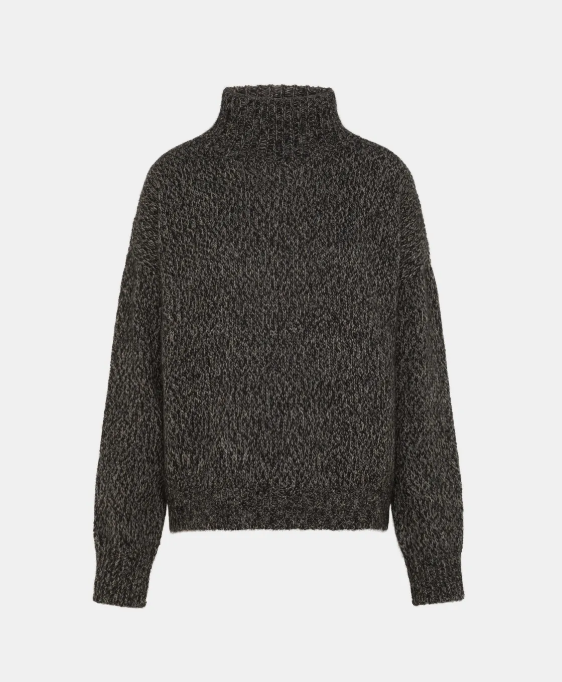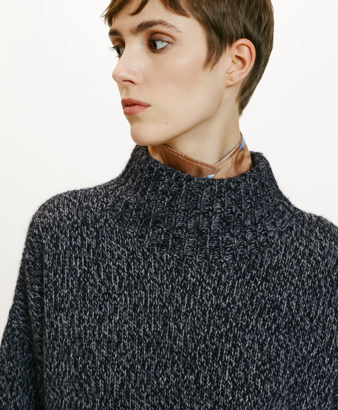 Tricot en mélange de laine, effet mouliné. Col haut, manches longues, coupe ajustée. Made in Italy