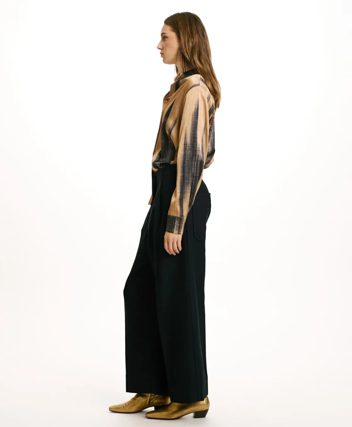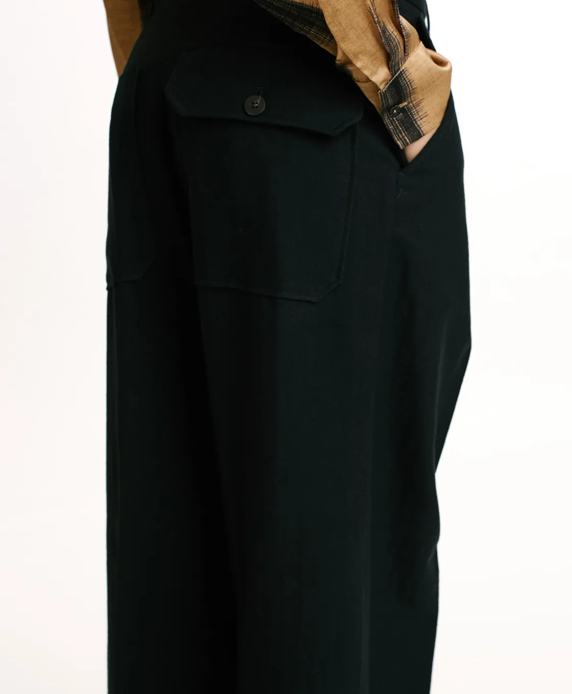 Pantalon polyvalent à la jambe large en chevrons de mélange coton et laine. La ligne sculpturale est soulignée par des pinces profondes et la longueur croppée, avec des revers au bas. Poches en denim à l’avant et rabat boutonné au dos. Boutonnage apparent et fermeture éclair.
