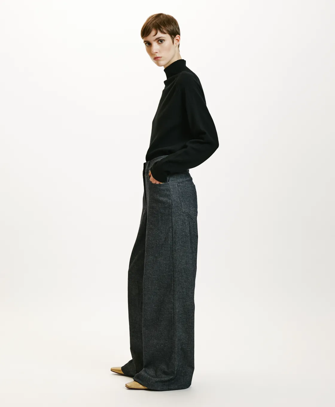 Pantalon polyvalent à taille haute avec une jambe large et évasée en denim de coton laine stretch. Des rivets ornent …