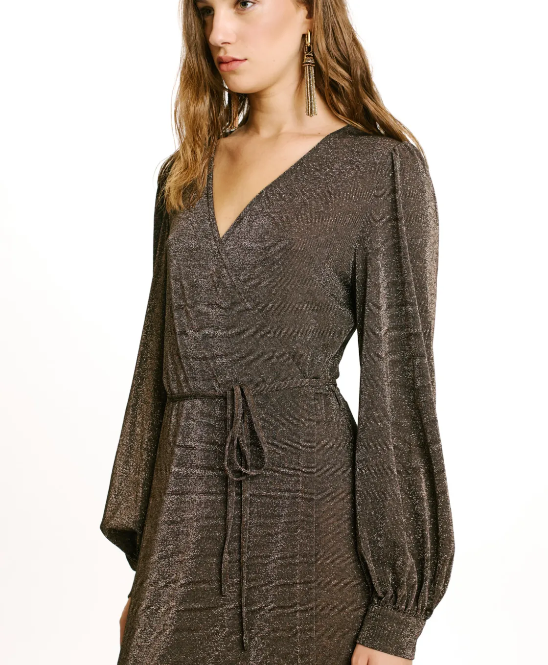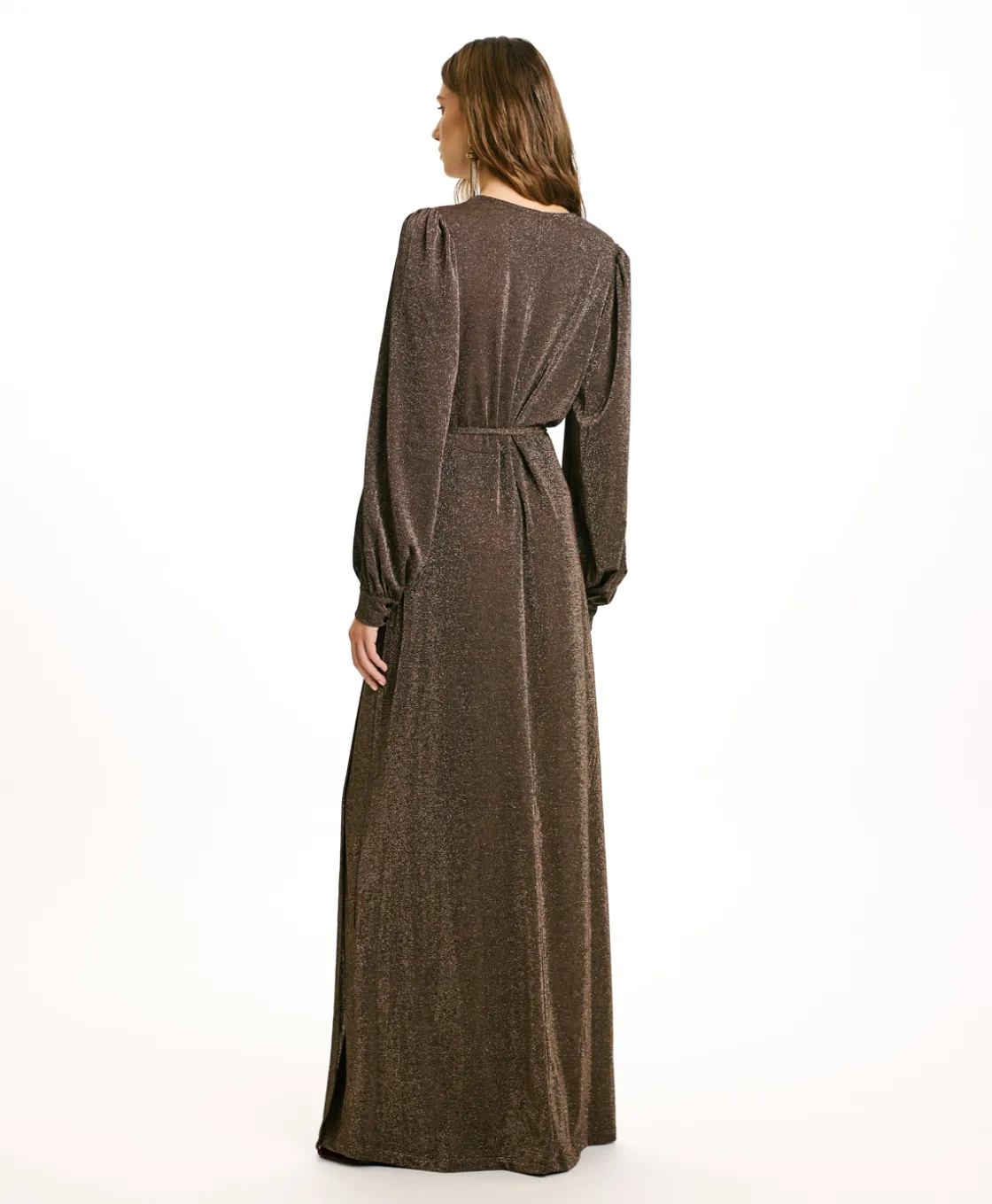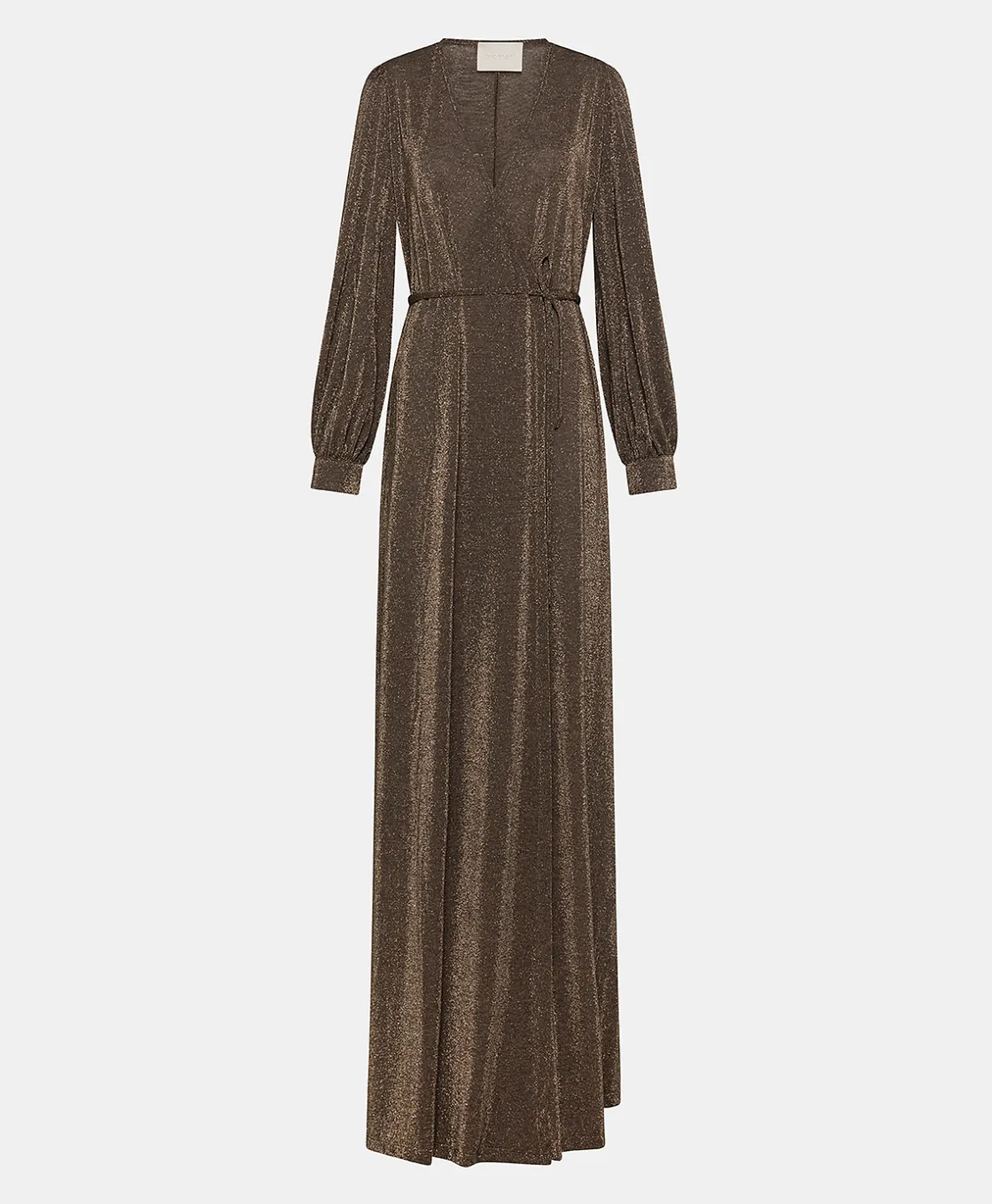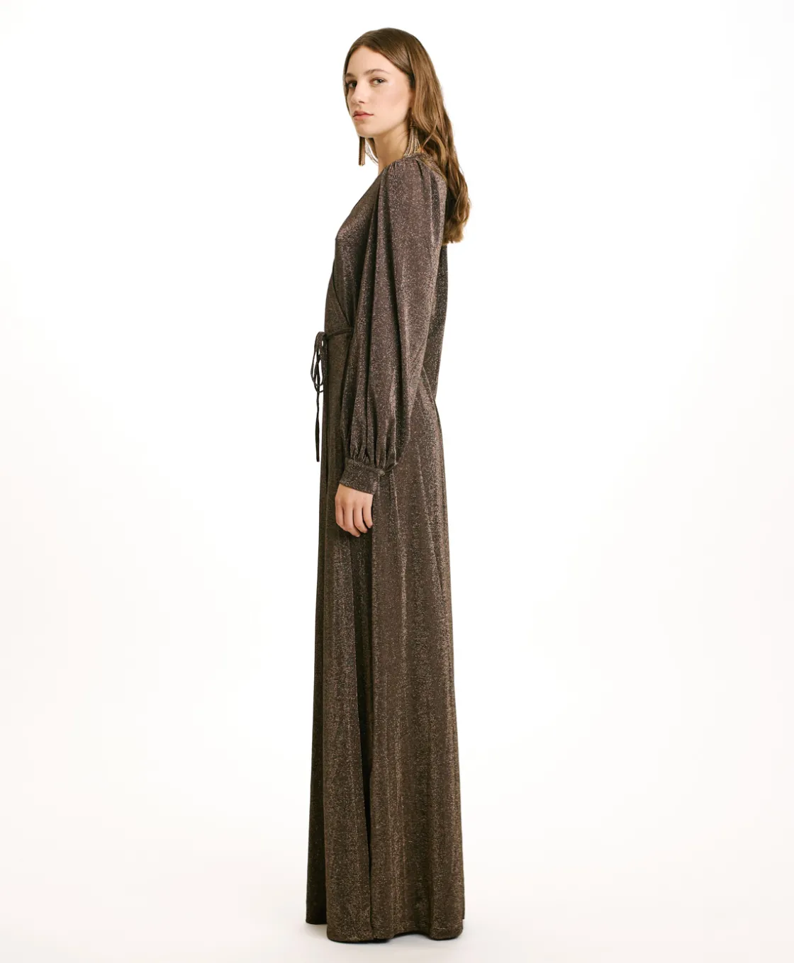 Robe longue croisée en jersey lurex avec décolleté profond et manches longues, conçue pour les occasions spéciales.