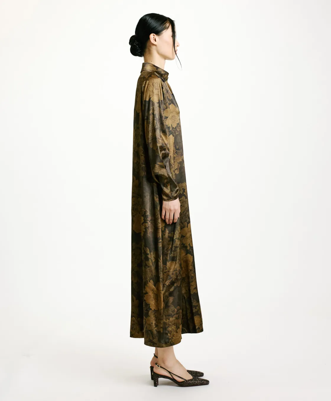 Une robe tunique longue raffinée et essentielle, à la ligne évasée, en satin de soie stretch imprimé. Présentant une encolure en V et un col voile, ce modèle possède des manches bouffantes relevées par un généreux pli au bas, au-dessus du poignet. Poches insérées sur les côtés.