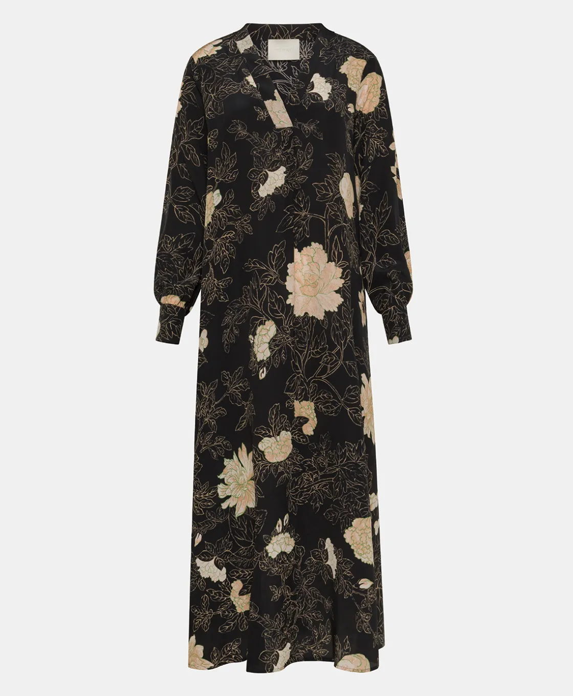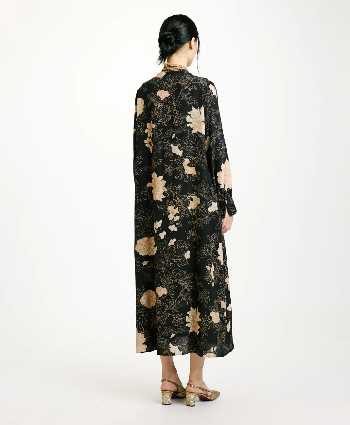 Tunique évasée en crêpe de chine de soie imprimée avec encolure en V sans boutons et plis centraux pour donner du volume au corps. Manches longues avec poignet haut, fermées par un bouton et un œillet élastiqué, avec une riche fronce au bas. Poches insérées sur les côtés.