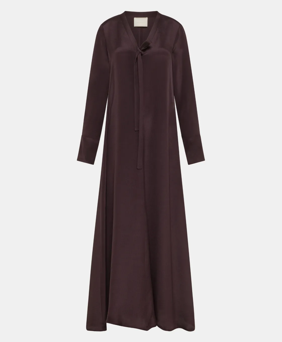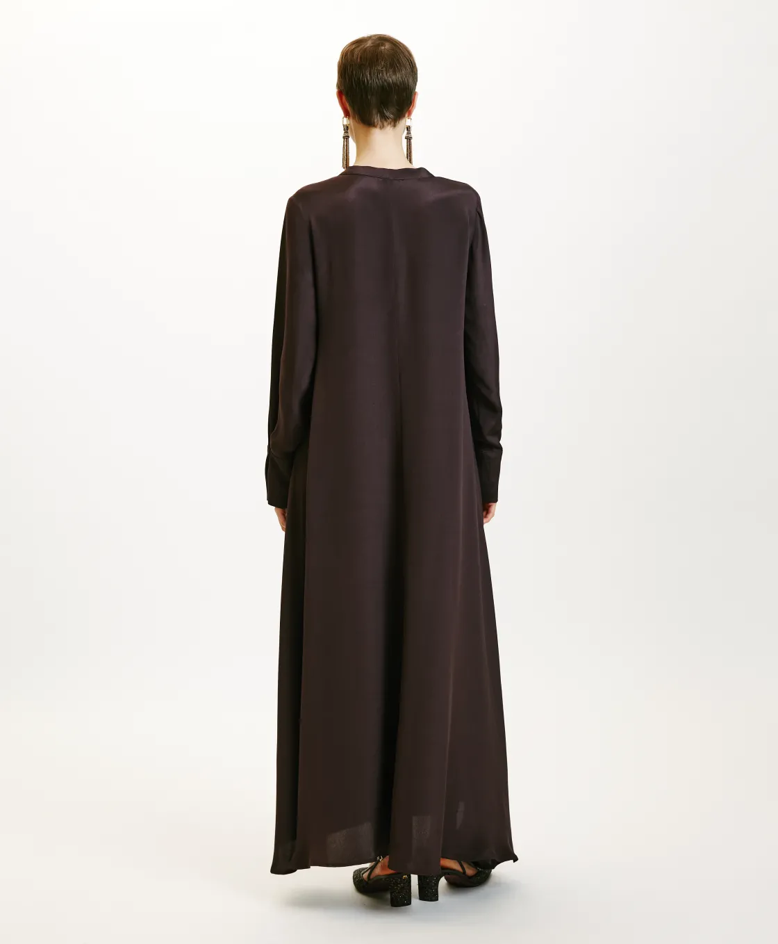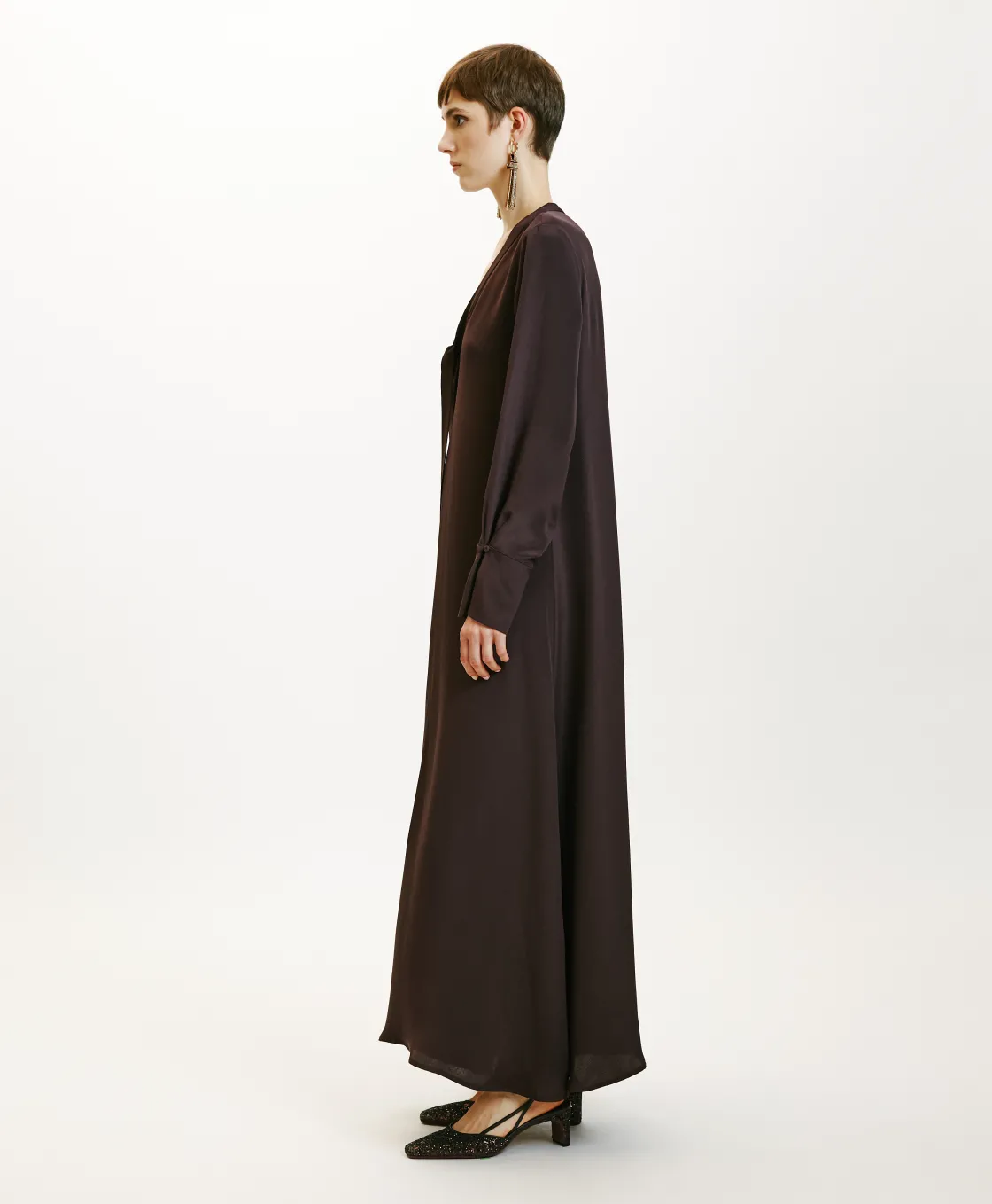 Longue robe évasée en mélange de soie, avec un profond décolleté en V et un fine bride sur le devant, à porter dénouée ou nouée. Manches longues avec poignet haut détaillé par un pli soufflet fermé par un bouton et une boutonnière élastique. Un vêtement recherché, indiqué pour toutes les occasions.