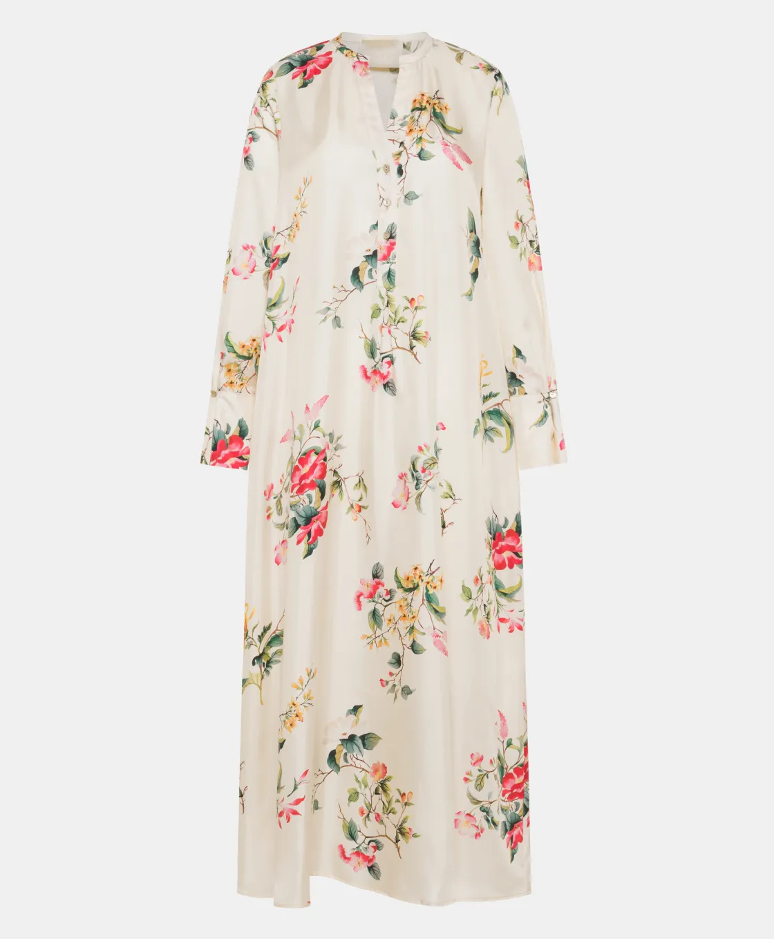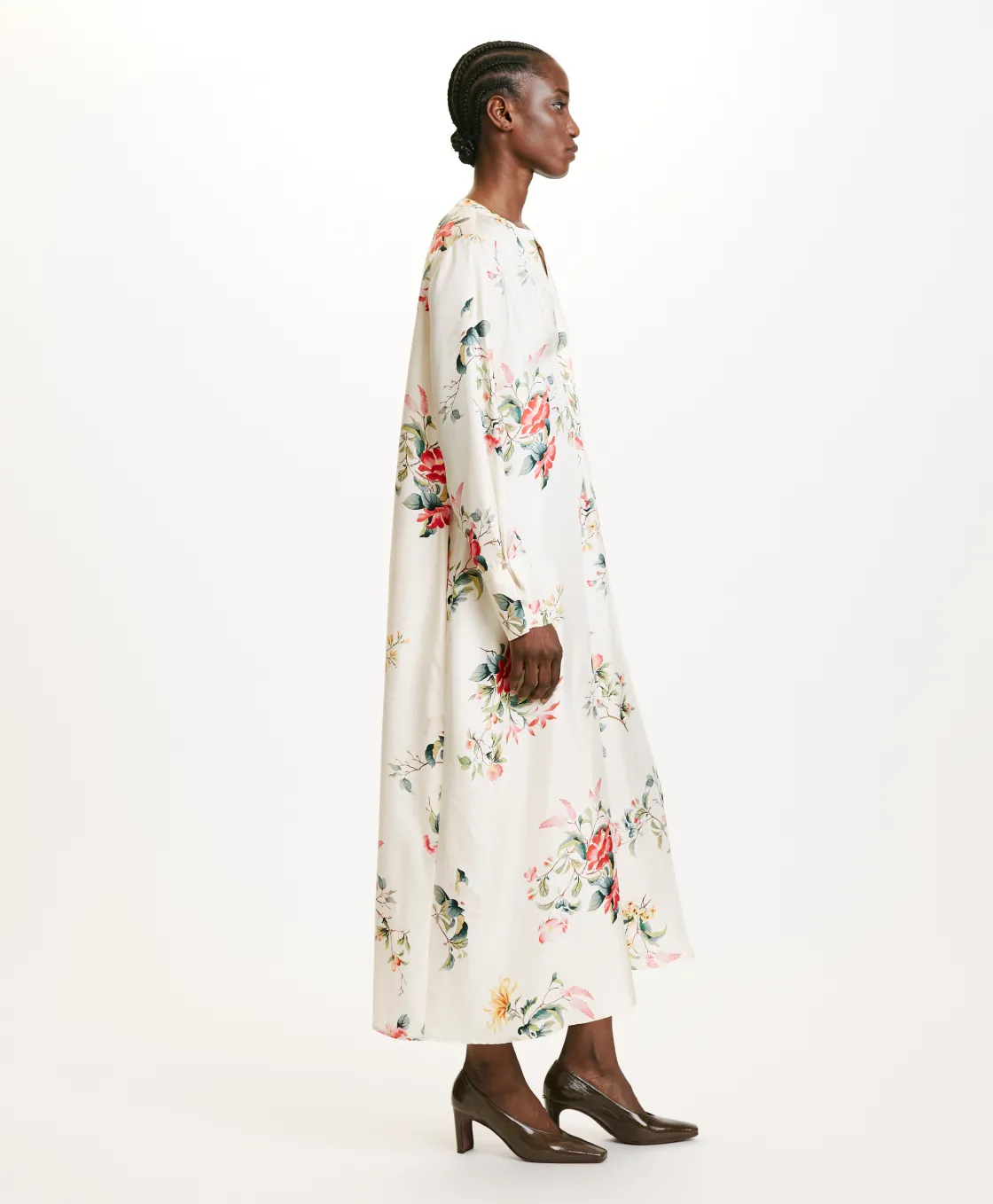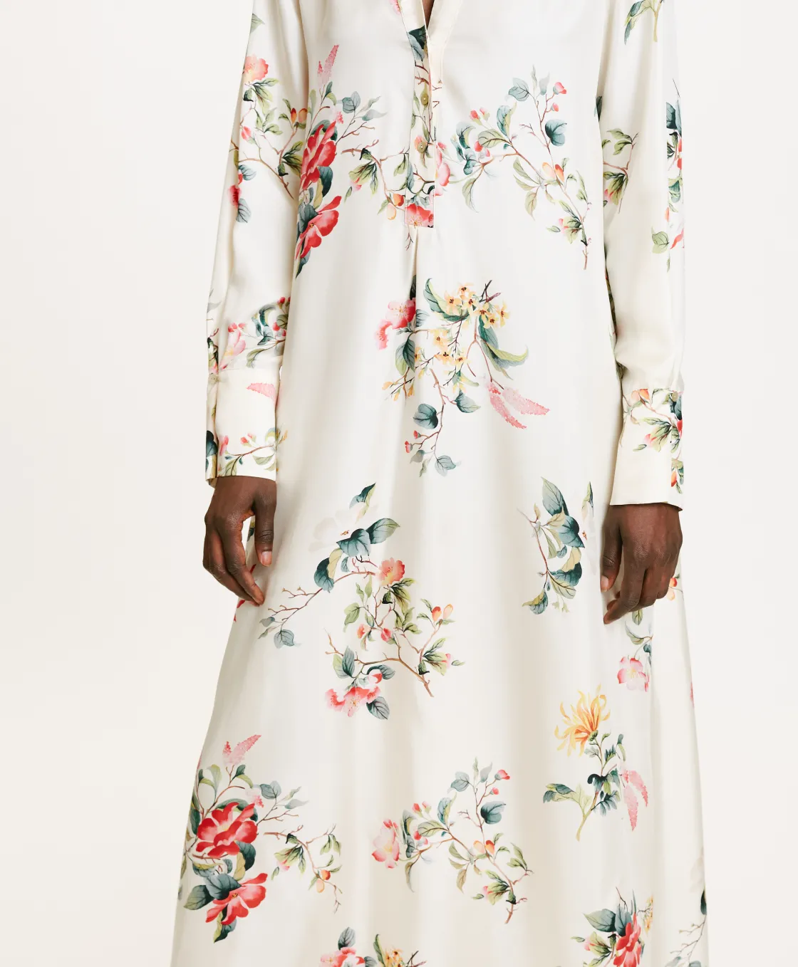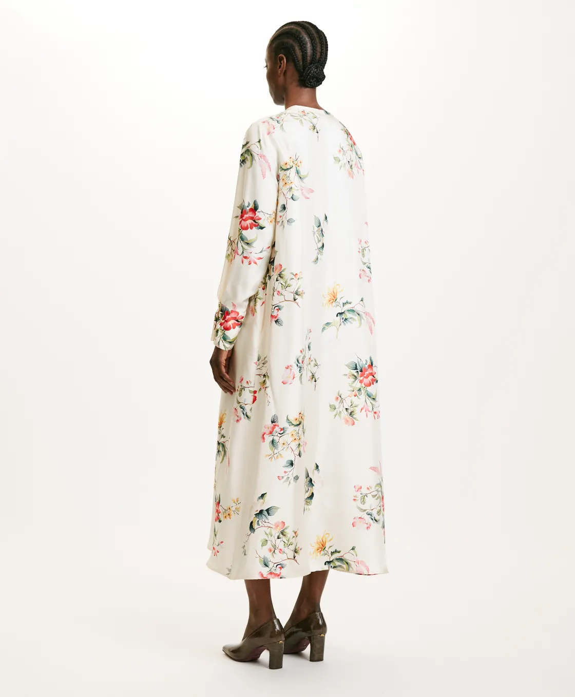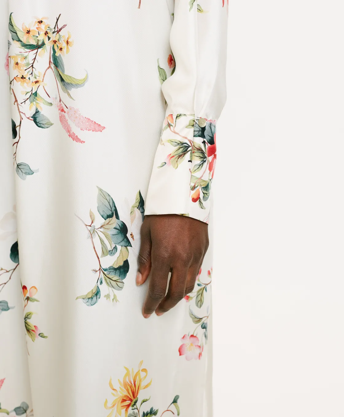 Robe longue versatile en sergé de soie pure imprimé avec col aux lignes en V, ouverture polo fermée par des boutonnières et des boutons, et manche longue avec poignet froncé au bas. Un pli sous l’encolure donne du mouvement à la silhouette de Yui.