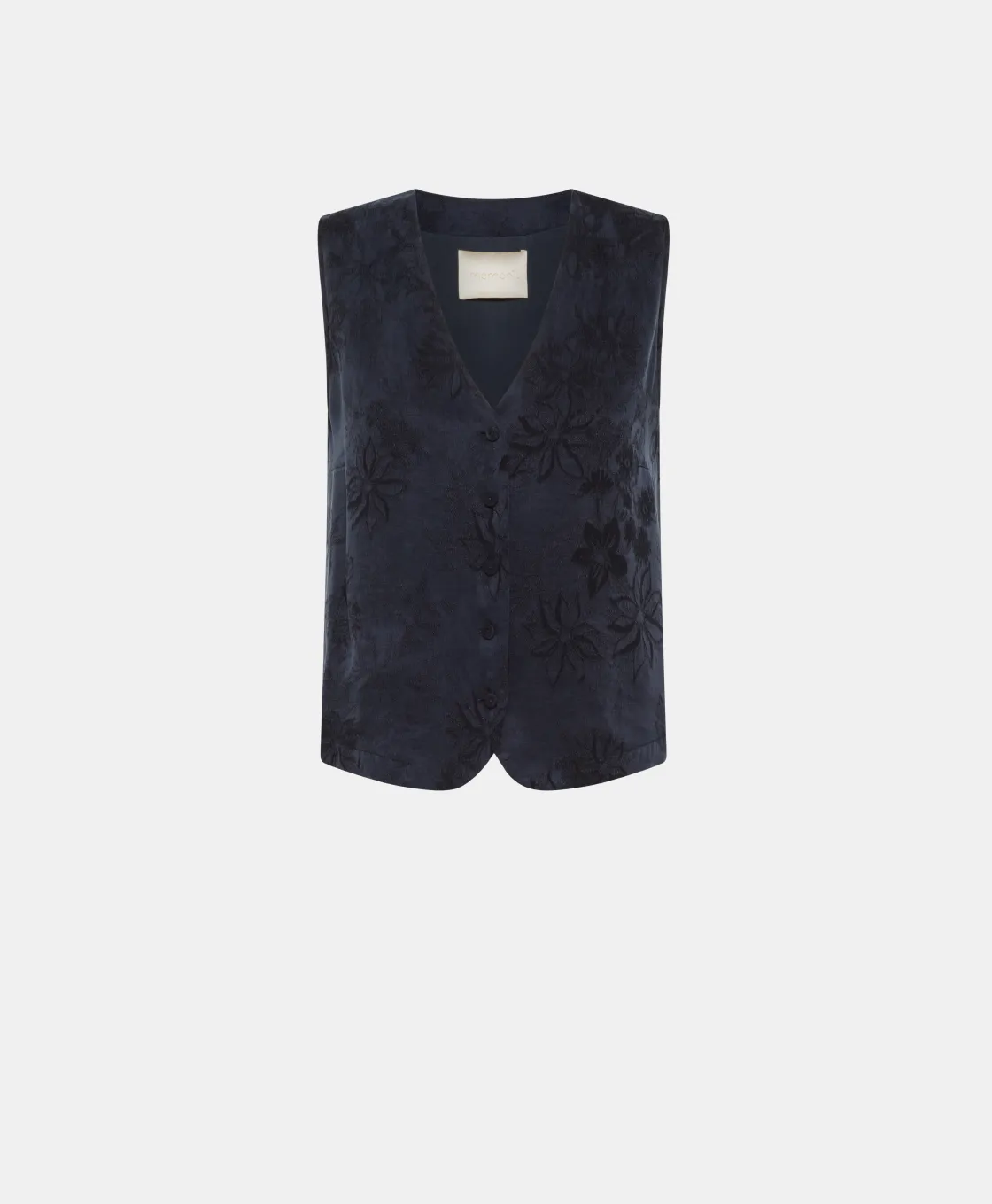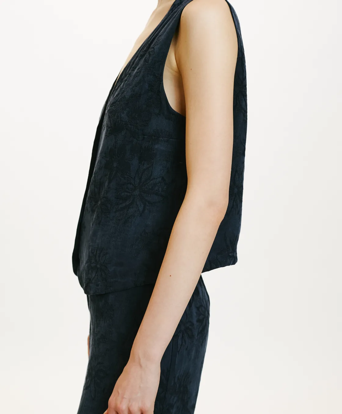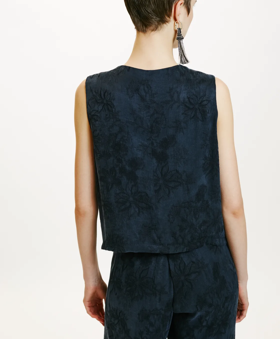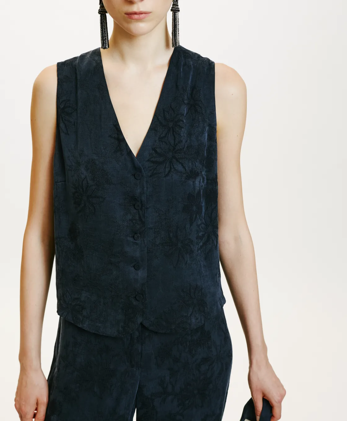 Gilet moulant en lyoncel et viscose avec motifs floraux en jacquard ton sur ton. Pièce de la garde-robe masculine rendue féminine par son col en V et sa ligne près du corps, elle peut être portée sur des chemisiers ou comme sous-veste en combinaison avec le blazer « Nagoya ». Poches passepoilées et construction doublée.